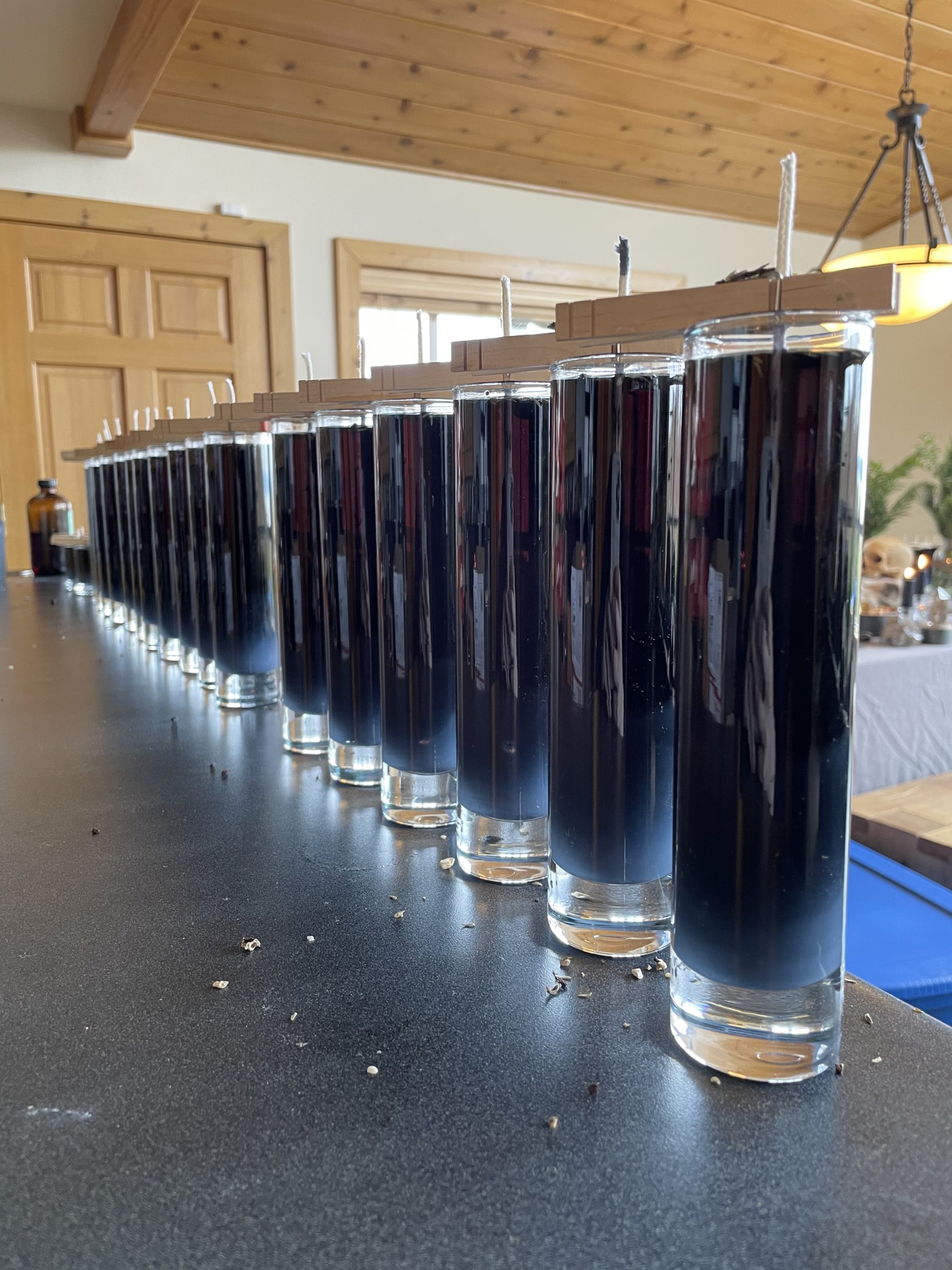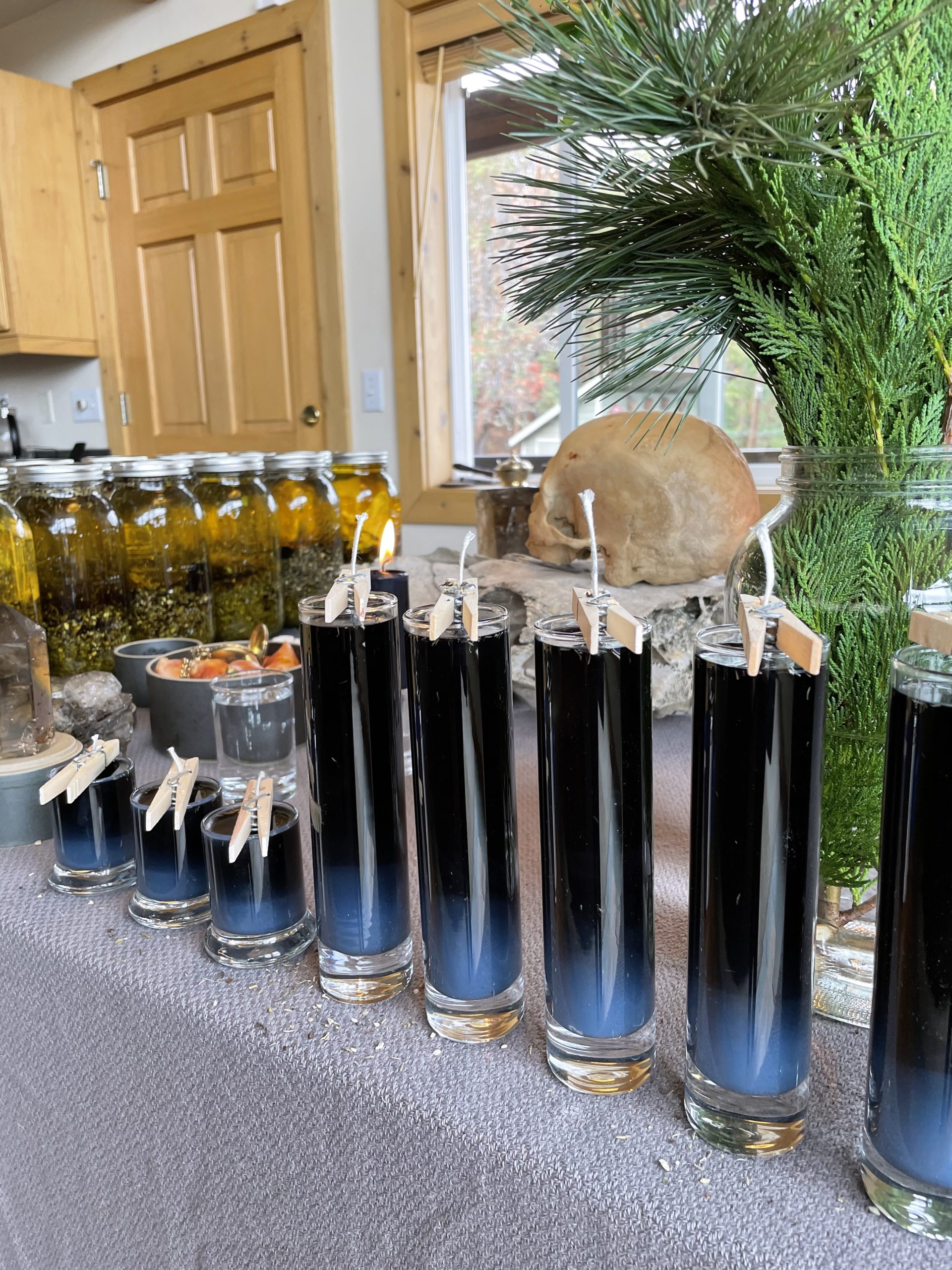Virgin soy wax dyed a dull blue-grey, poured over consecrated Saturn in Capricorn herbal mix and solidified during our election window.
