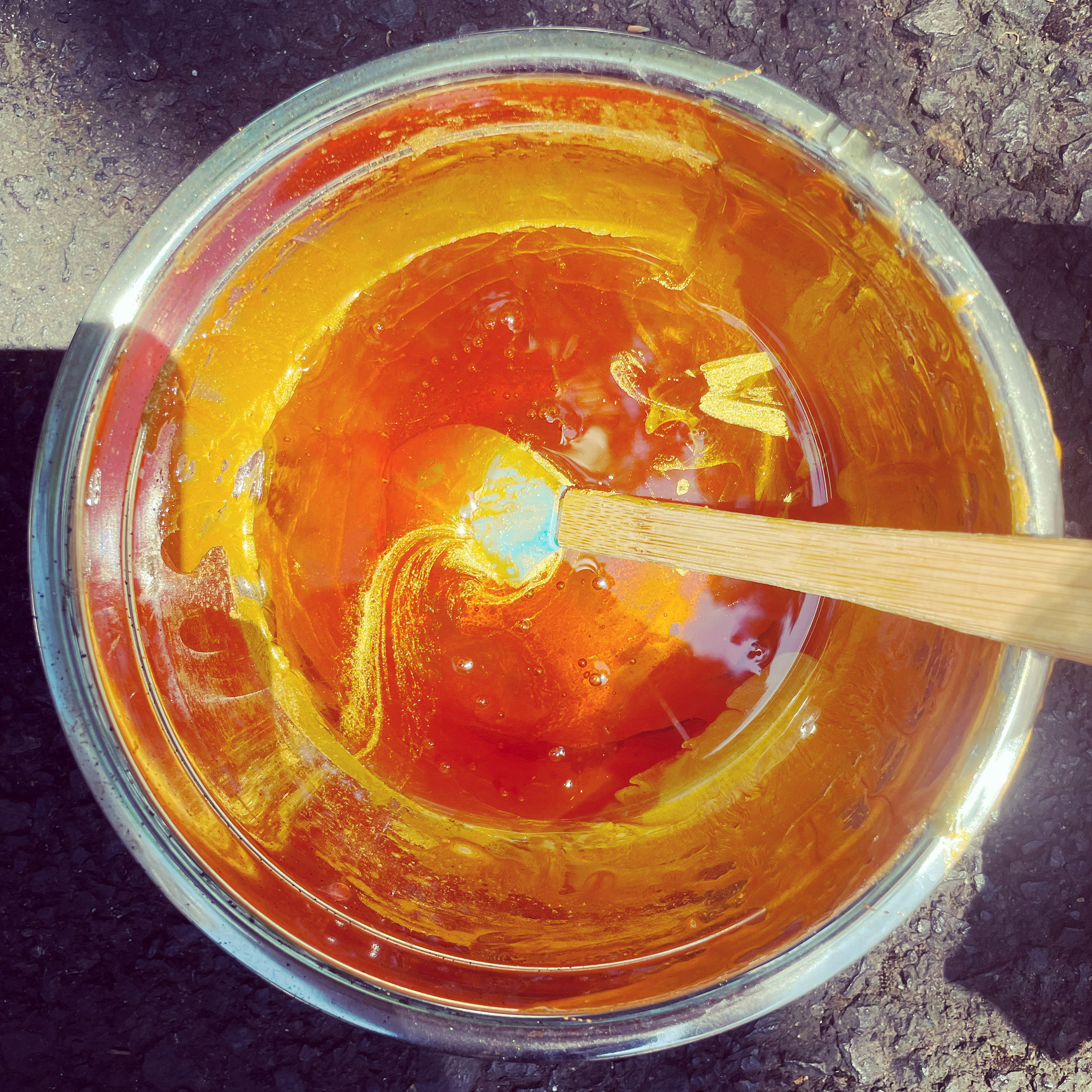 Dead Sea salts, organic, ritually consecrated Son of Apollo herbal blend, organic clover honey, beer [see the Ritual Bathing Protocol for an explanation!], and golden mica. Frankincense, red and yellow mandarin, tangerine, helichrysum, and turmeric.