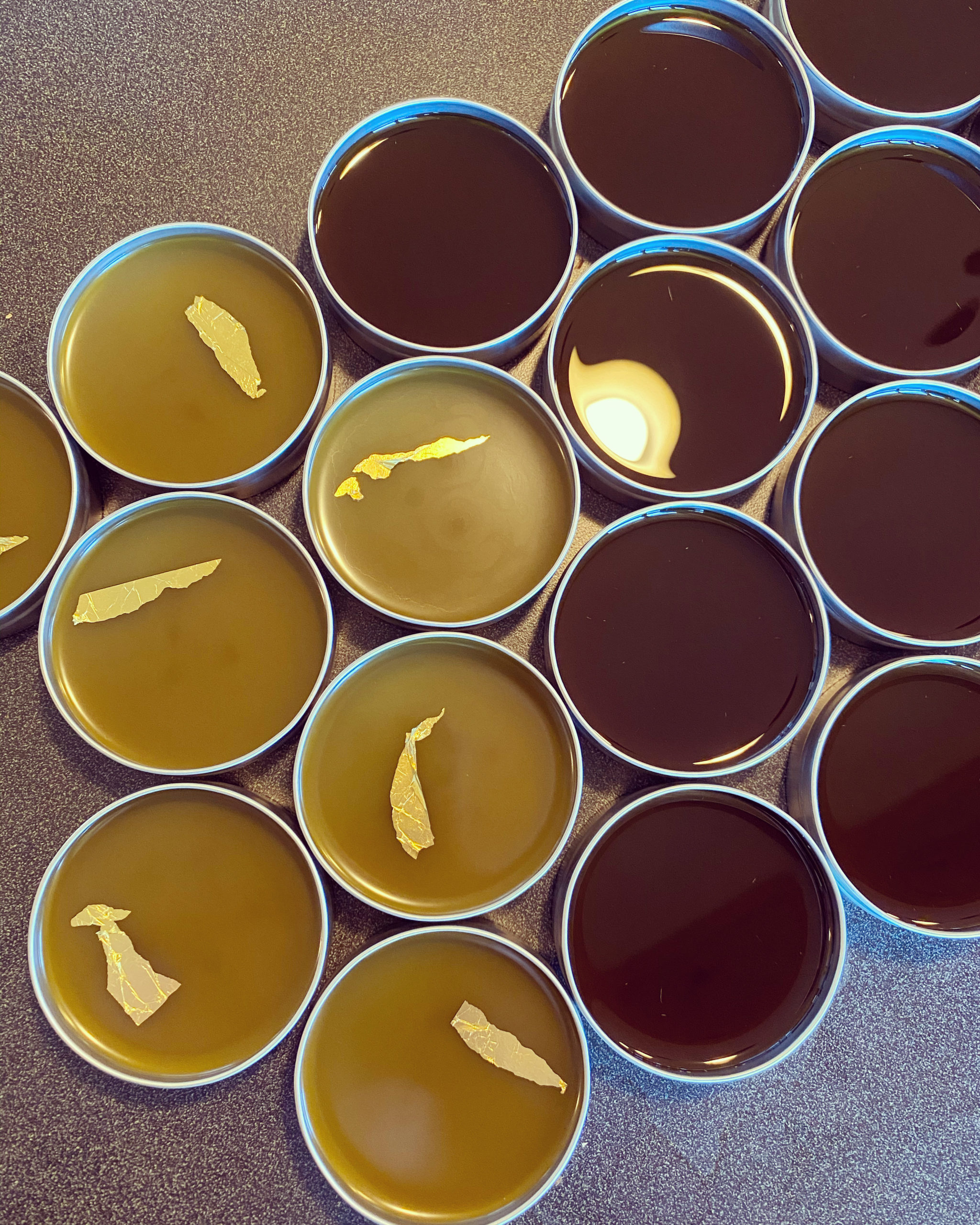Left to incubate and shaken on Sundays in the hour of Sol for many months, before being mixed with organic beeswax and essential oils of frankincense, wintergreen, and eucalyptus, and poured in accord with the Sun’s timing as Humanity’s Own Star rejoiced in rulership. Topped with 24k gold leaf.
