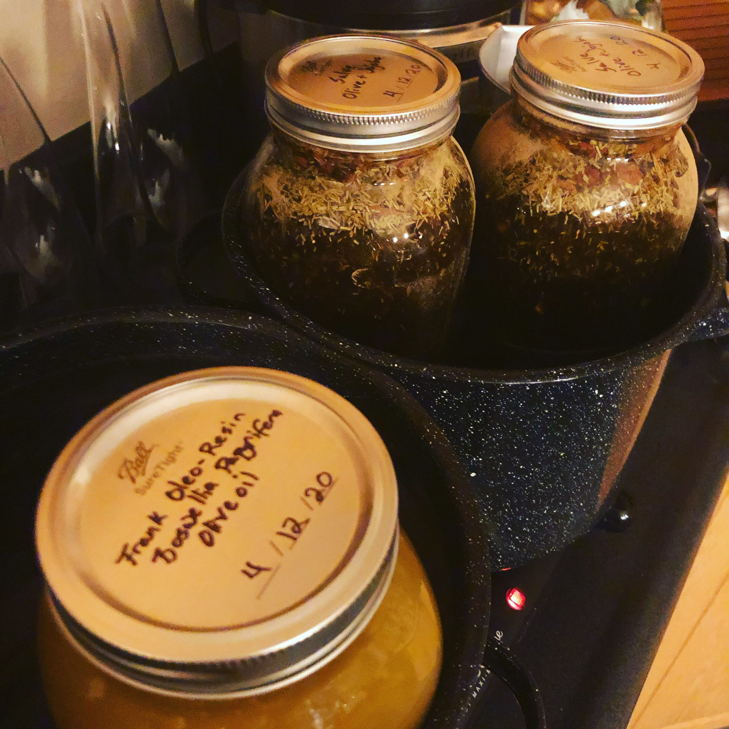 Calendula, St. John’s wort, goldenseal, yellowdock root, comfrey root, and balm of gilead, suffumigated during the Son of Apollo election. Immersed in our 50/50 oil + liquid wax and placed upon the Asclepius altar before being moved to the front porch to greet the rays of Sol’s rising on his Father’s day.