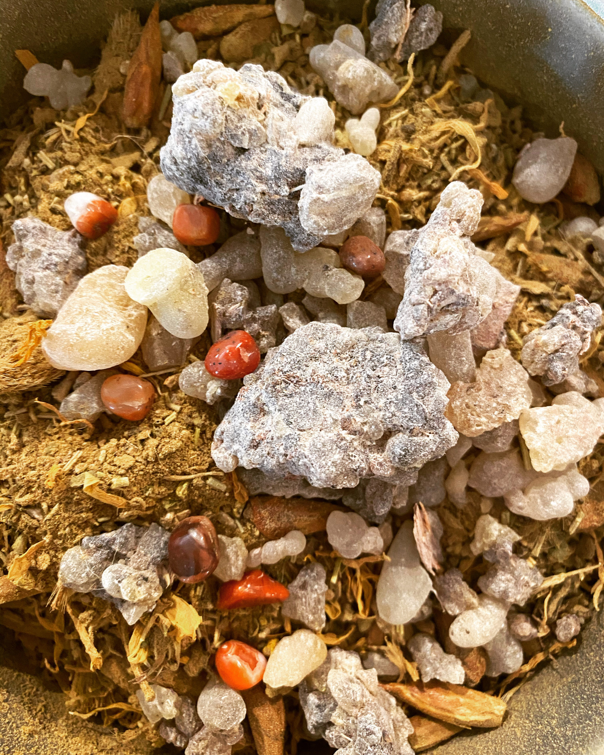 100% uncut organic herbs, resin, gemstone, and genuine gold leaf. Add corn starch or another fine carrier to create a TON of your own sachet powder.