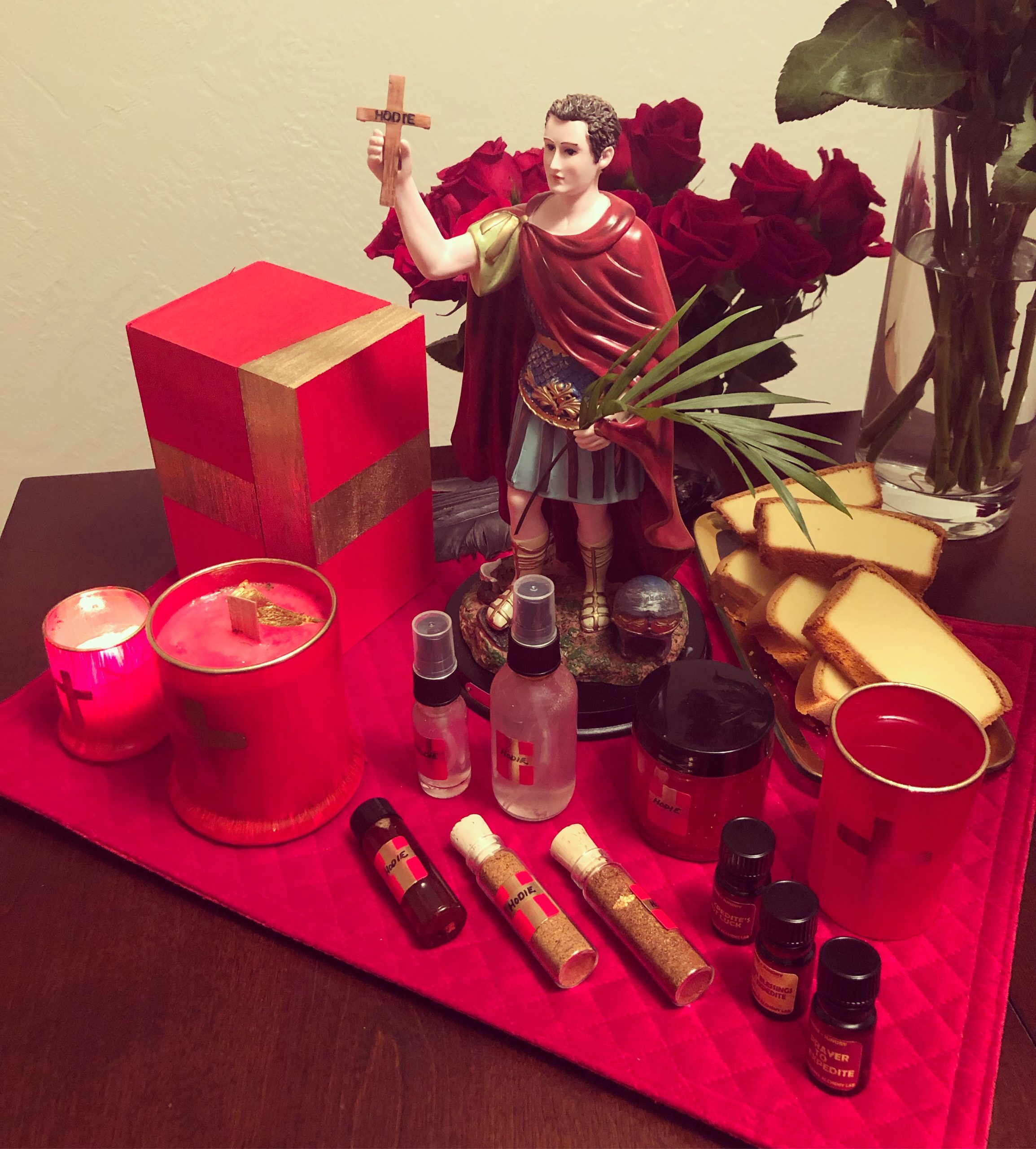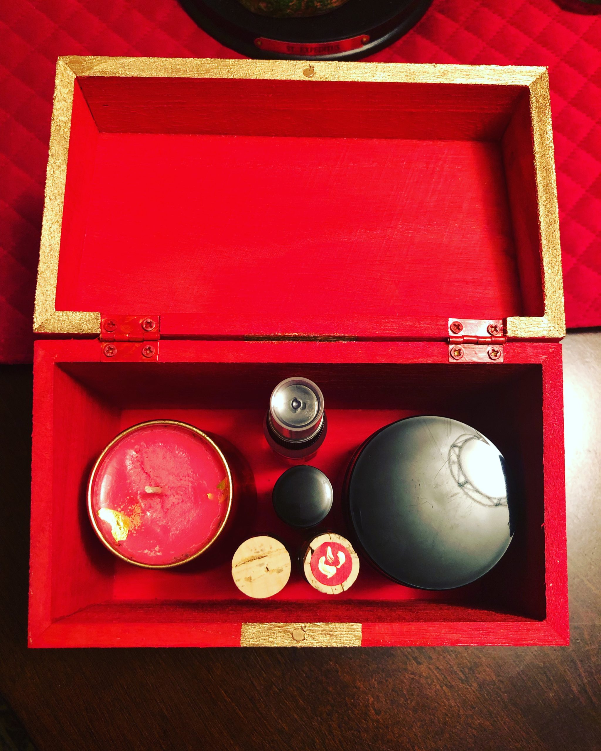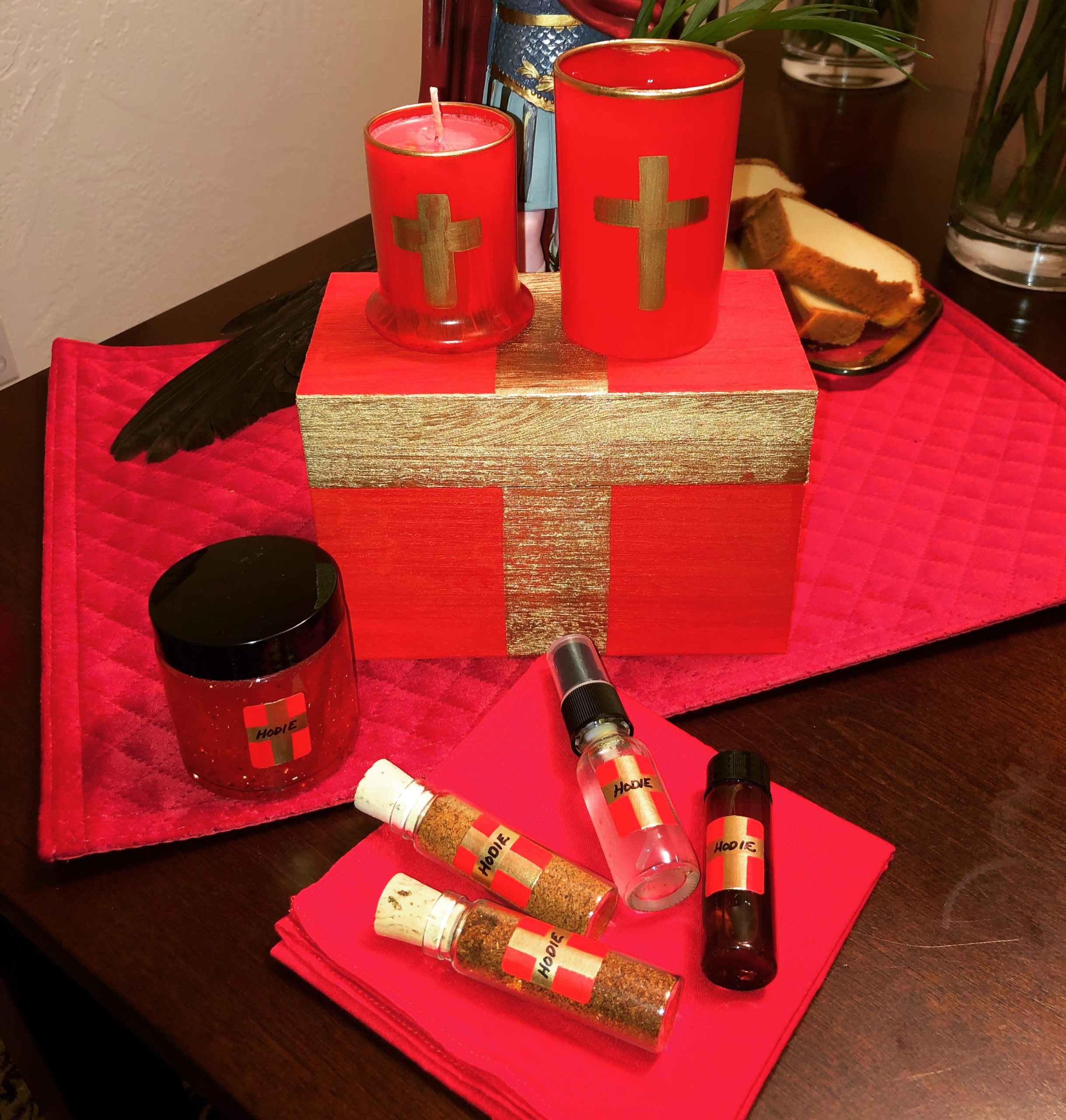 Wooden boxes hand-painted red and with a gold cross design to match the candle jars and offering glasses, along with miniature red altar cloth. Large enough to house all of our Expedite offerings in small form, the price of which includes the full set —