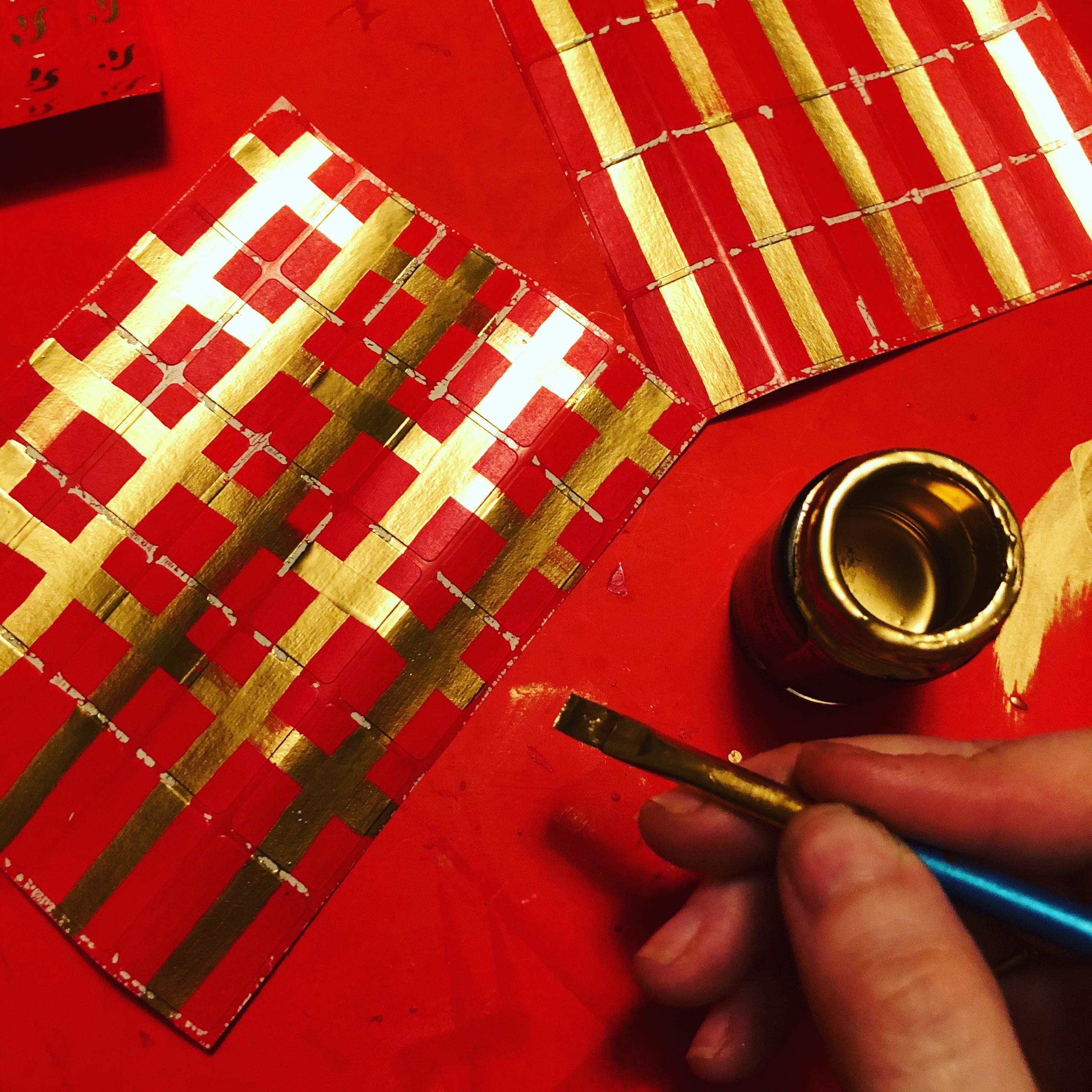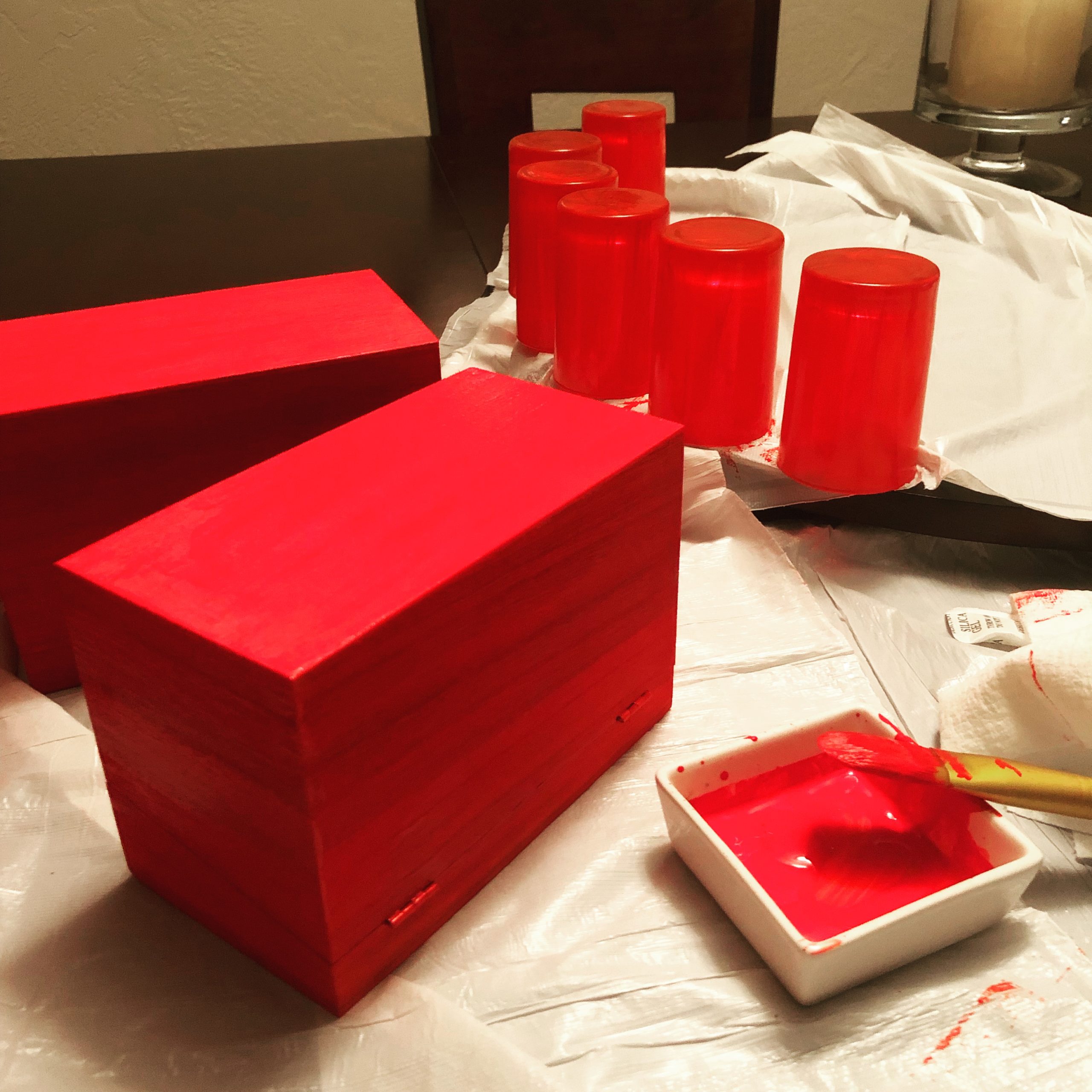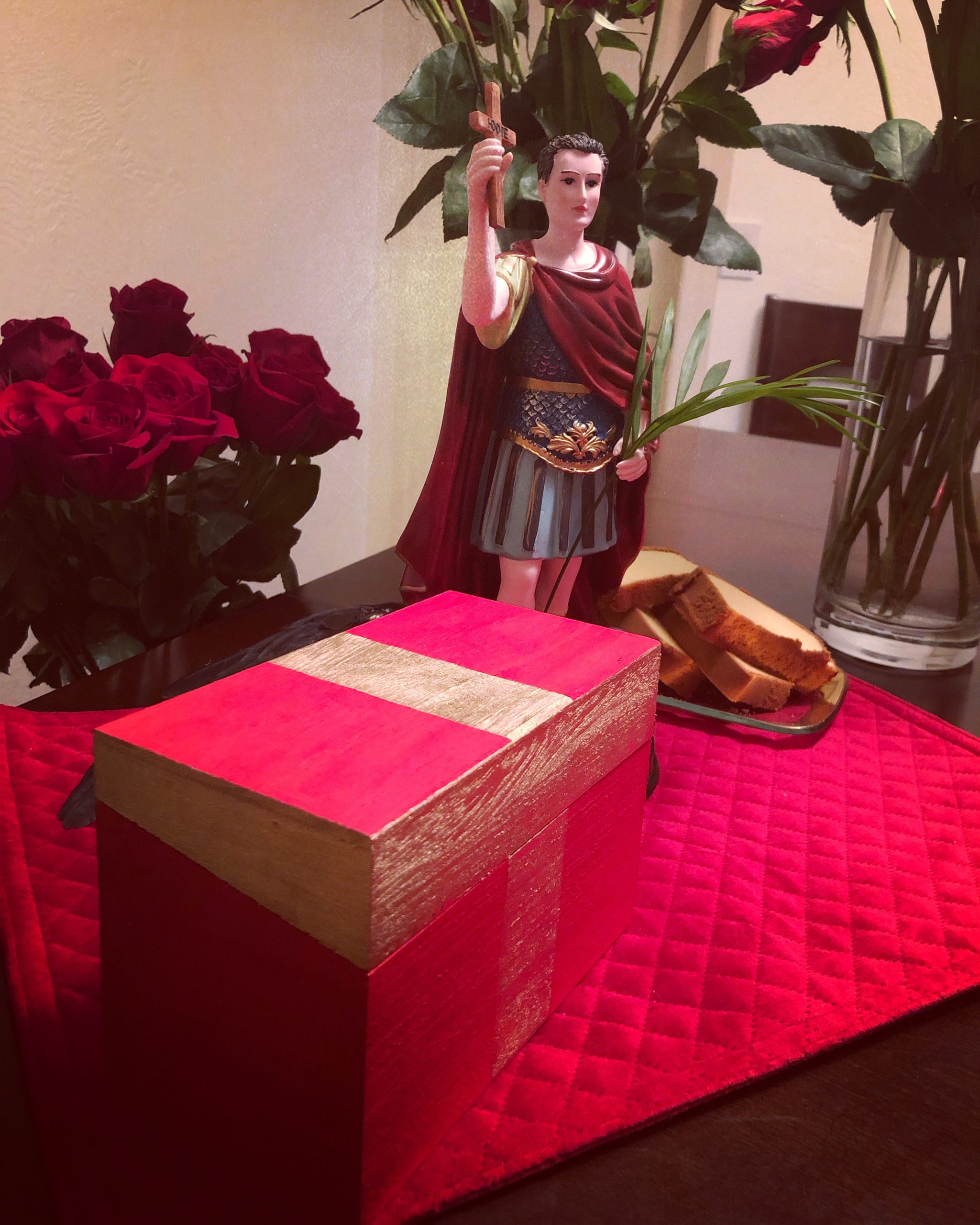 Wooden boxes hand-painted red and with a gold cross design to match the candle jars and offering glasses, along with miniature red altar cloth. Large enough to house all of our Expedite offerings in small form, the price of which includes the full set —