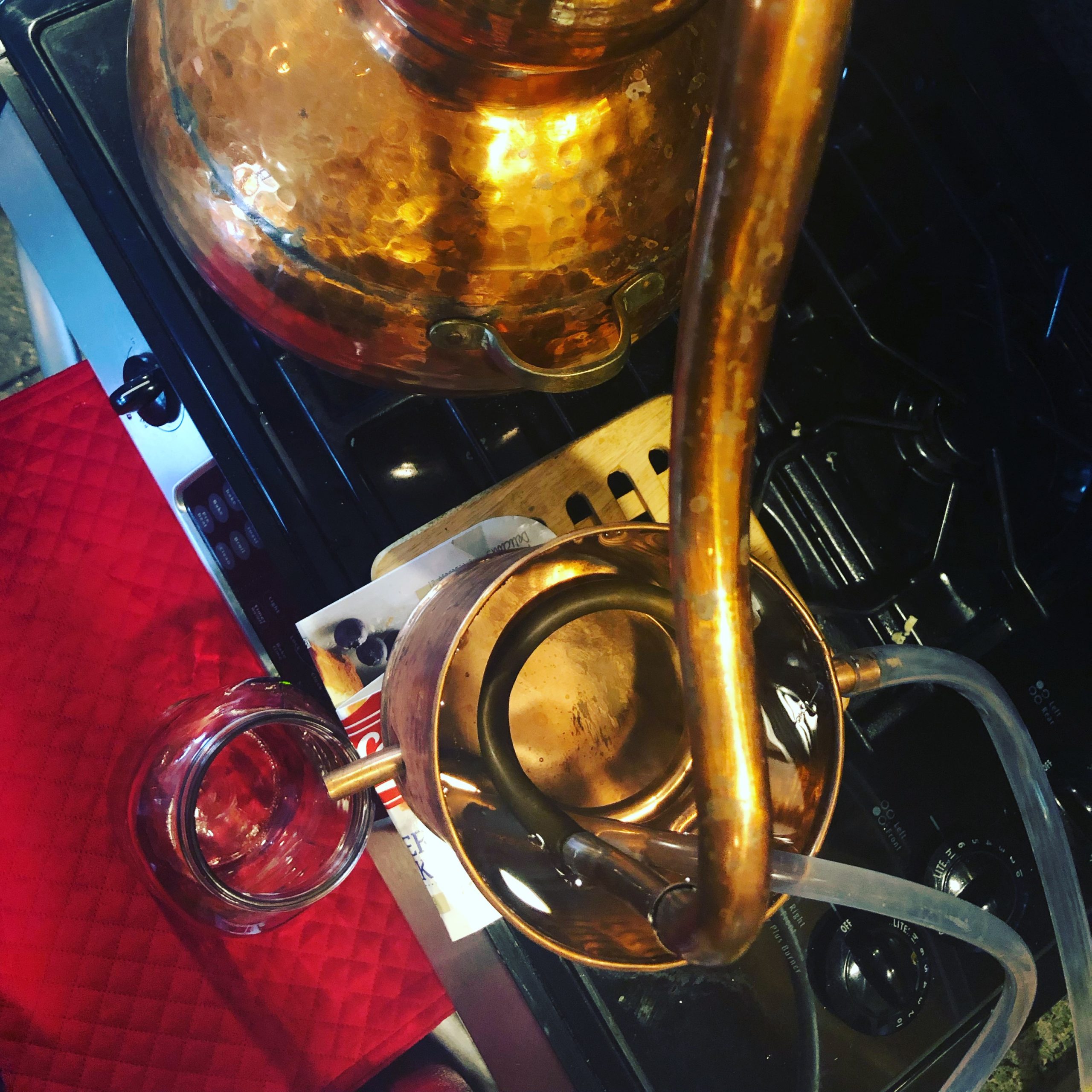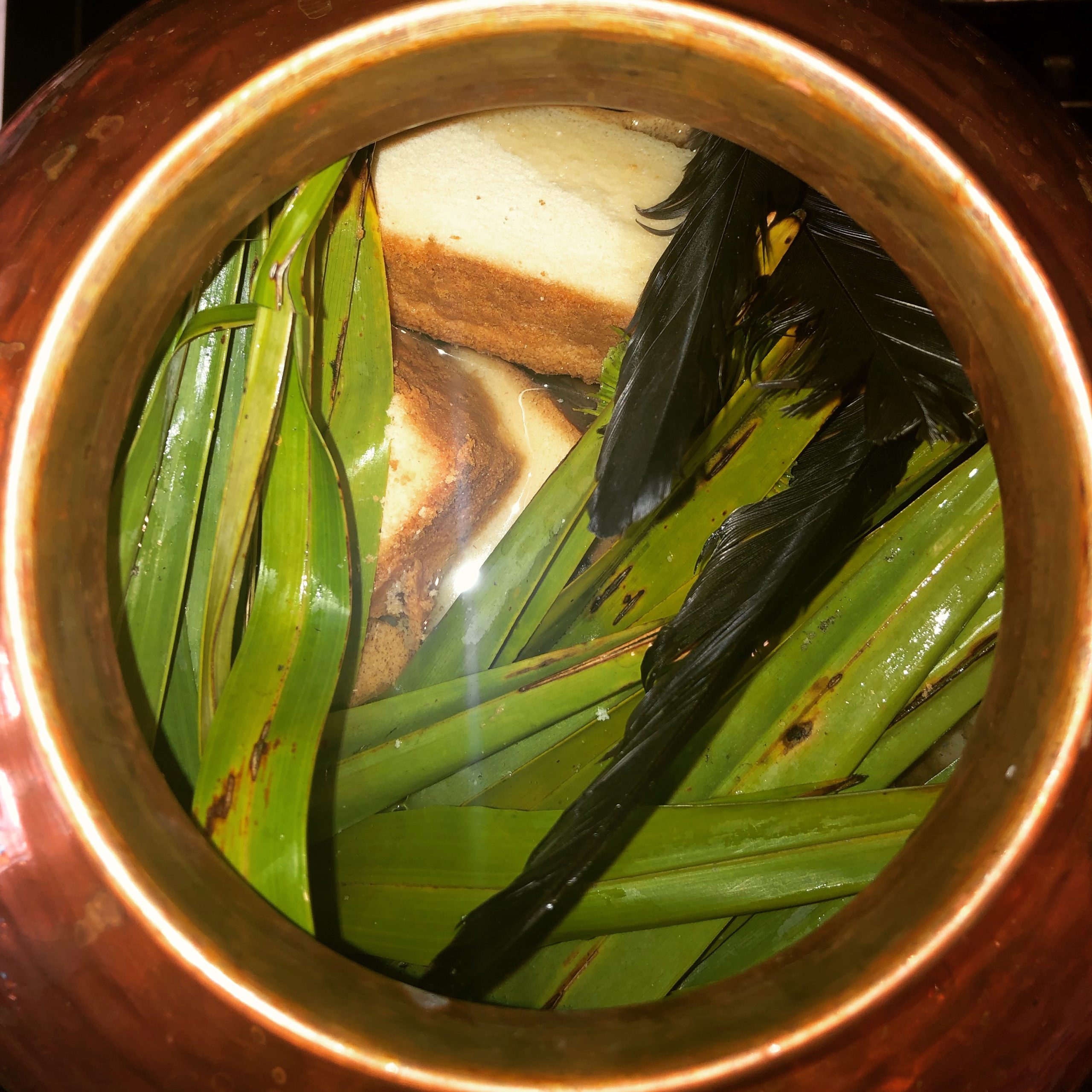 On the Wednesday before the election, poundcake, palm frond, and crow feather were distilled to create the base hydrosol for St. Expedite’s spray. This was ritually combined with colloidal gold and essential oils of cinnamon and citrus during the series election and prayed over for Expedite’s blessing. Holy Water from a Catholic Church, collected freshly after a Sunday mass, was a final addition just before bottling.