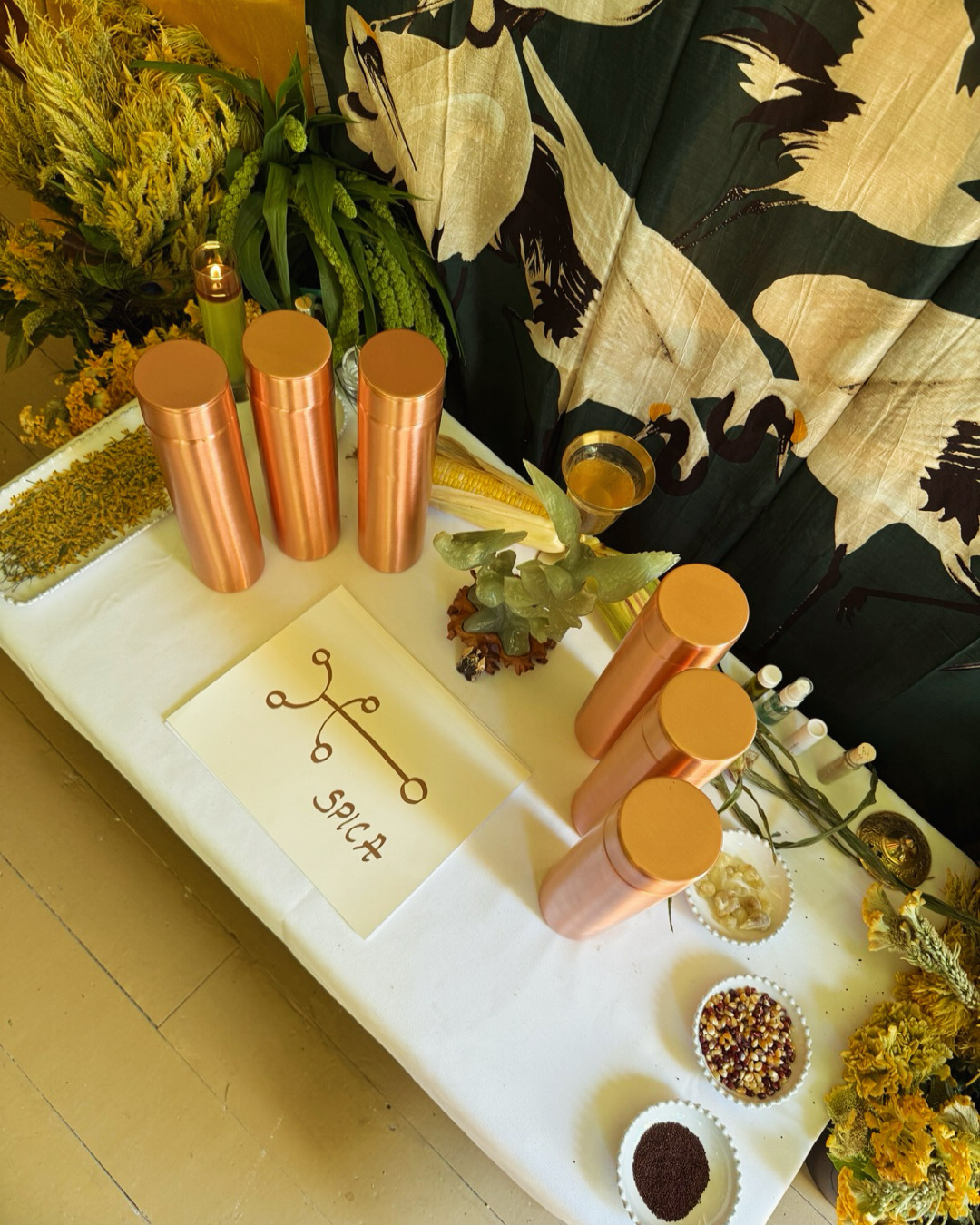 Beautiful, extra large copper water bottles hand etched on the interior cap (to touch the water) and at the base, at the height of the election window by your Mage truly; with Spica’s glyph and within, the image of a bird.