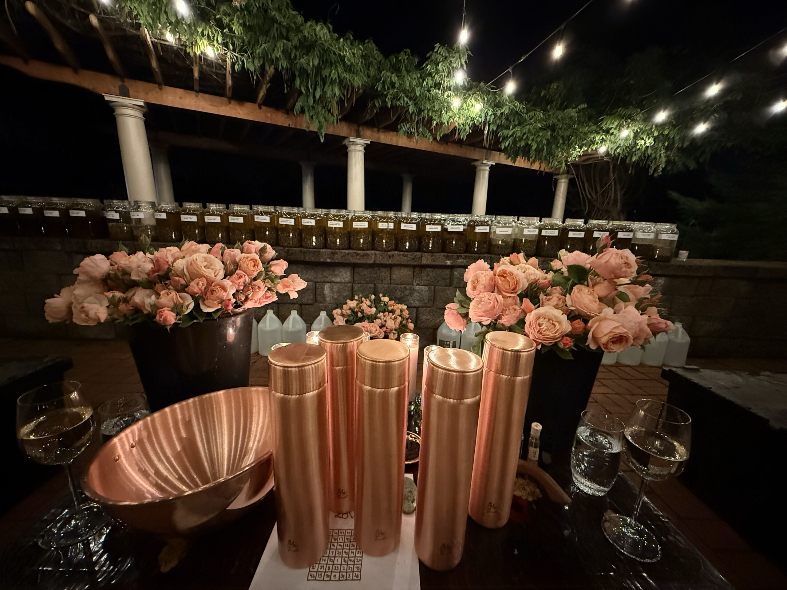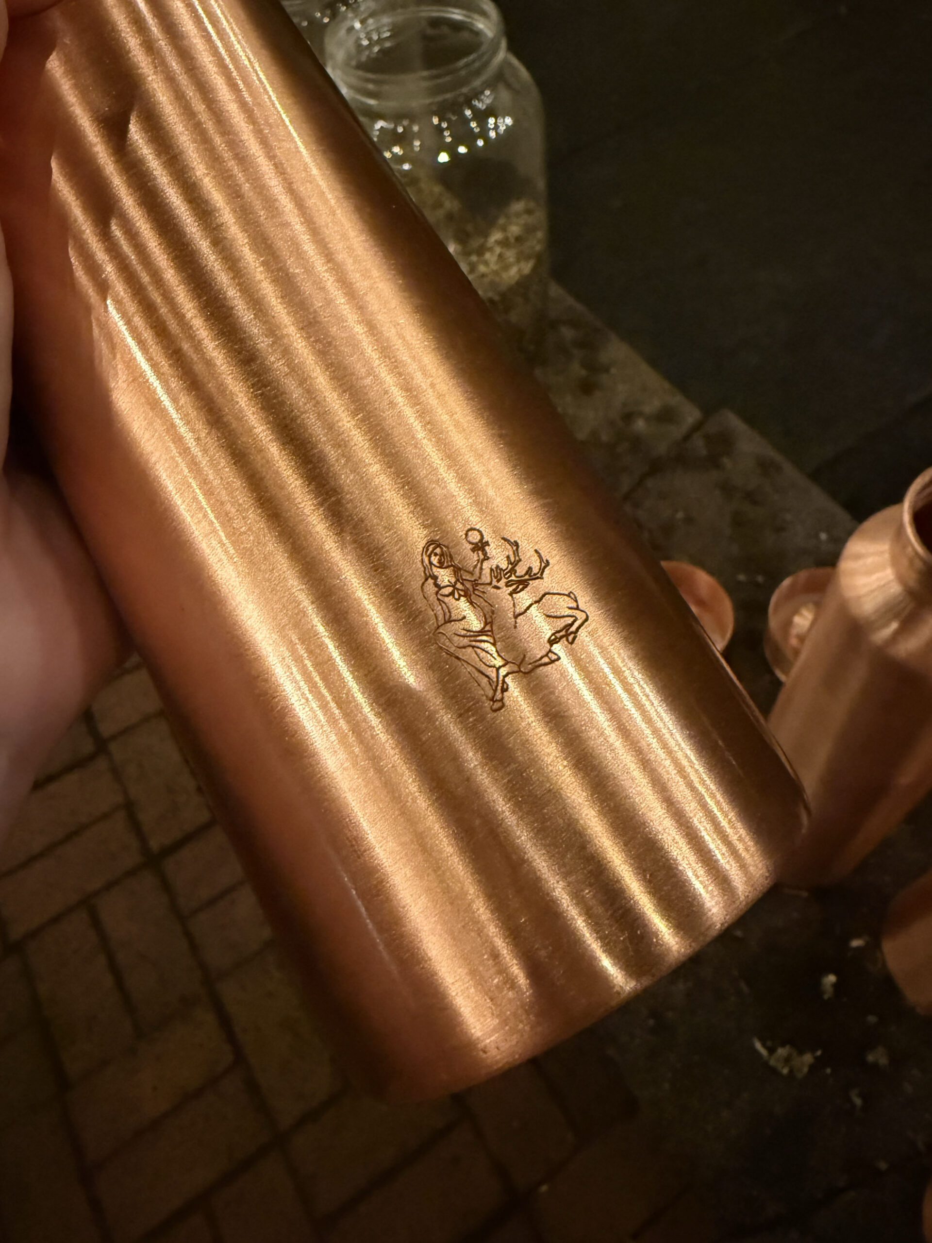 Beautiful copper water bottles were laser etched with a small image of a beautiful maiden holding a hand mirror beside a stag during the height of our Venus in Taurus III election.