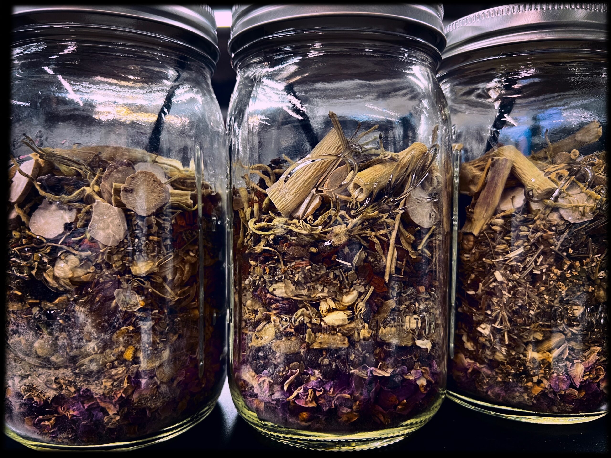 Ground allspice and allspice essential oil (Pimenta dioica), cacao nibs, shells, and absolute (Theobroma cacao), cardamom essential oil and pods (Amomum subulatum), red clover from the TAL garden (Trifolium incarantum), wild harvested benzoin gum and essential oil (Styrax benzoin), marshmallow leaf, flower and root from the TAL garden (Althaea officinalis), French jasmine absolute (Jasminum grandiflorum), motherwort from the TAL garden (Leonurus cardiaca), orris root and absolute (Iris germanica), ground nutmeg and essential oil (Myristica fragrans), patchouli root and essential oil (Pogostemon cablin), red sandalwood (Pterocarpus santalinus), tonka bean (Dipteryx odorata), vanilla bean and absolute (Vanilla planifolia), wild harvested blue vervain (Verbena hastata), yarrow herb and essential oil from the TAL garden (Achillea millefolium), reishi (Ganoderma lucidum), honey absolute (Apis mellifera), CO2 extract of butter, and ylang ylang essential oil (Cananga odorata).
