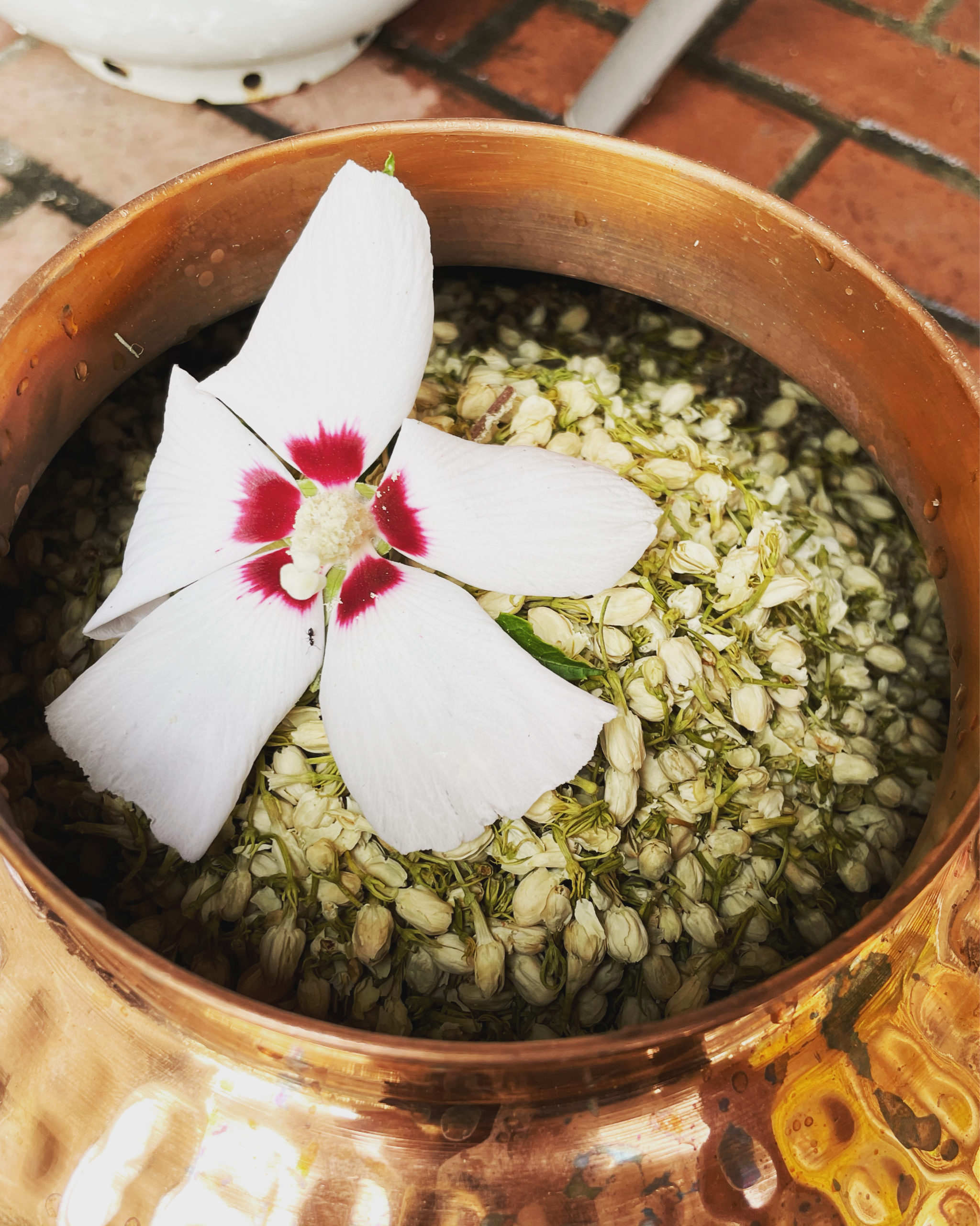 Water collected from the headwaters of Mt. Shasta, distilled across multiple copper alembics with jasmine, emerald, and freshwater pearl starting in the hour of Venus on the day of our Aerial Delight.