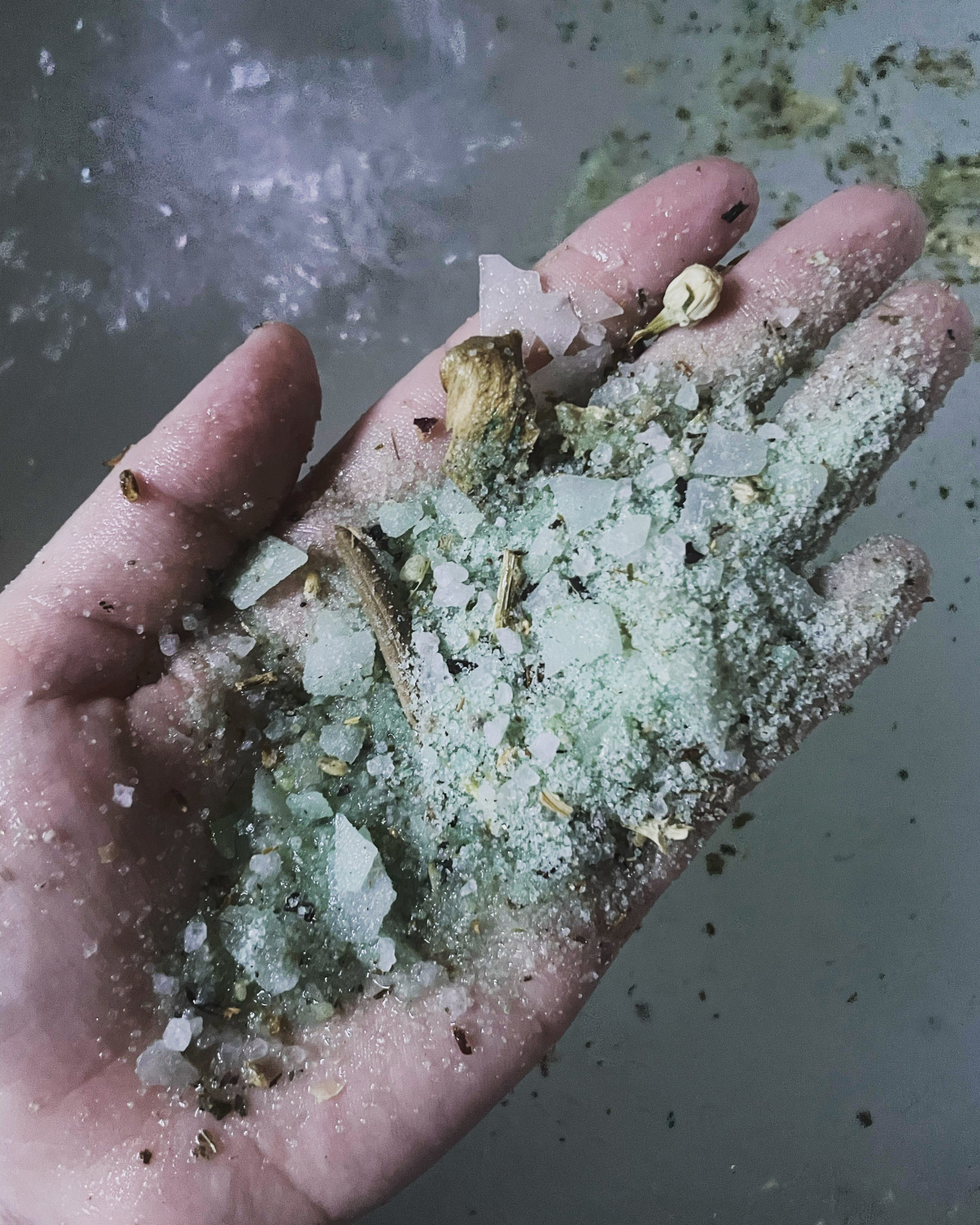 These salts are gorgeous and give my skin a golden glow. I now live in a very dry climate area where I’m use to the back of my arms being bumpy and itchy. When I use these salts, all the bumpy skin goes away and what’s left is soft and supple. This will leave a green ring around your white tub tho, but I found that a dish towel soaked in water and dawn dish soap cleans it right off without too much fuss. Ethereal vibes afterward. Highly recommend!