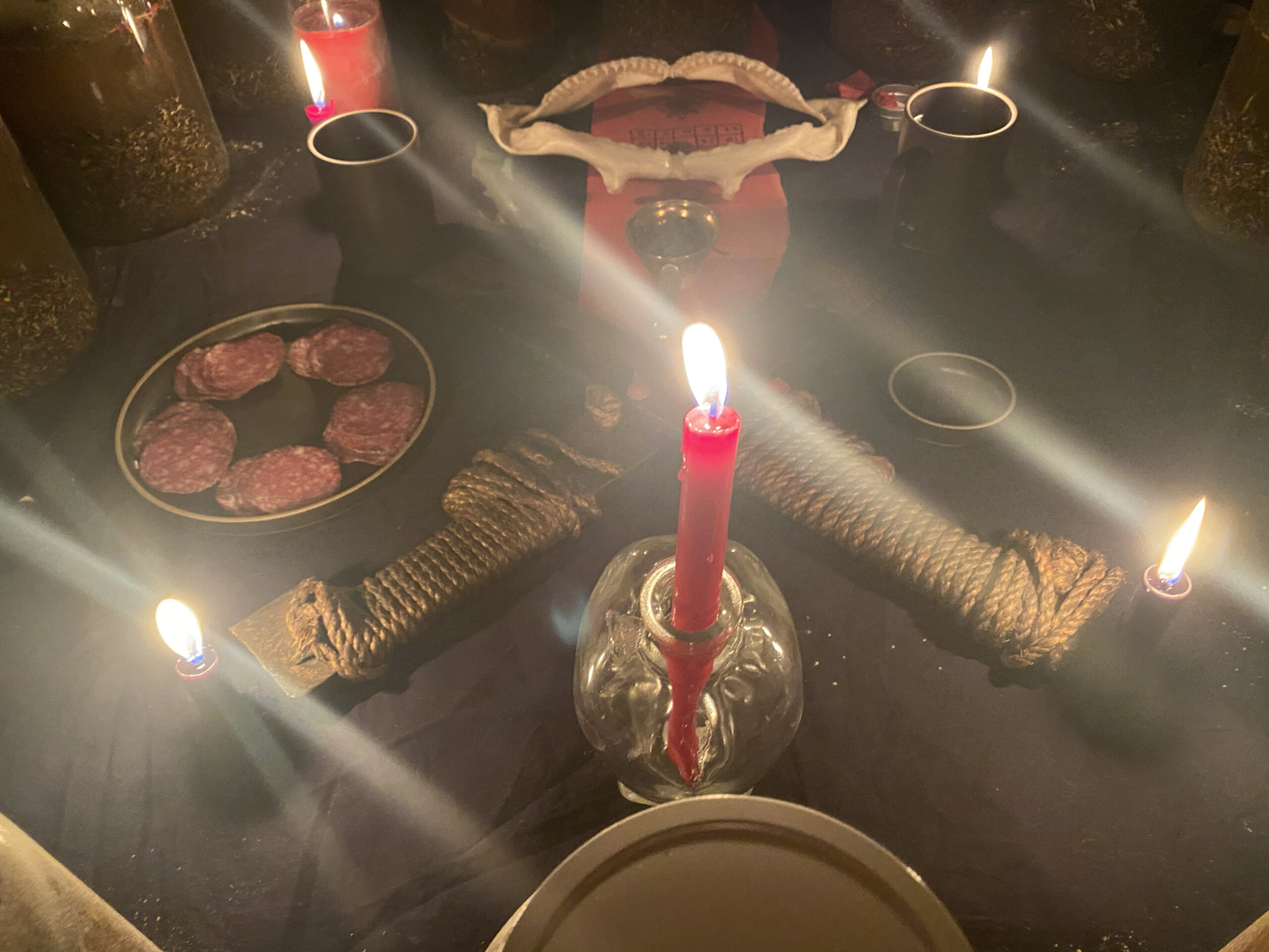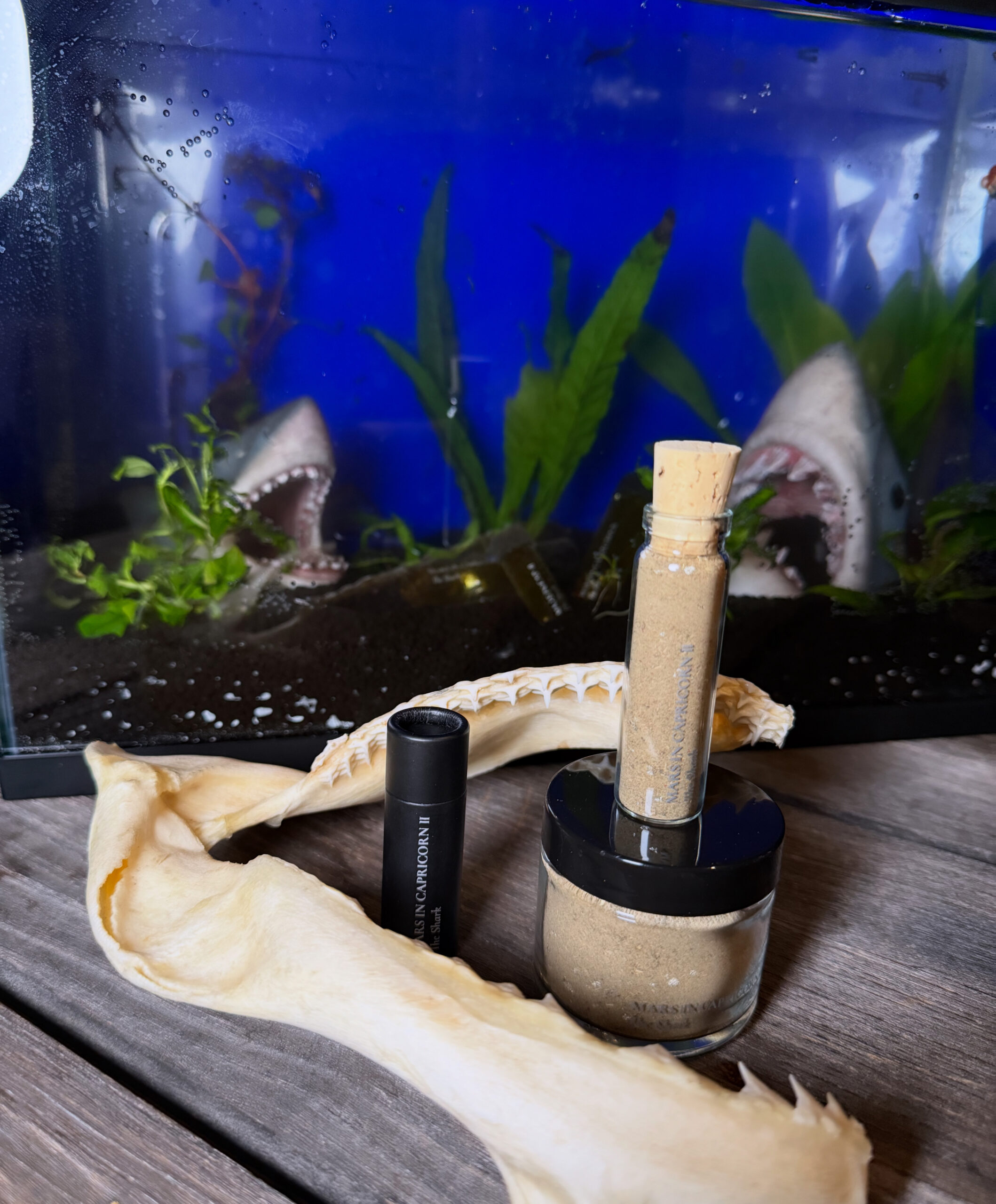 A subset offering Anointing Oil, Incense / Powder, and Chapstick imbued with shards of shark tooth and jaw bone from the Mars in Capricorn II working Altar, along with devil’s shoestring, master root, bladderwrack, plai, elemi, eucalyptus, white gold, and more.