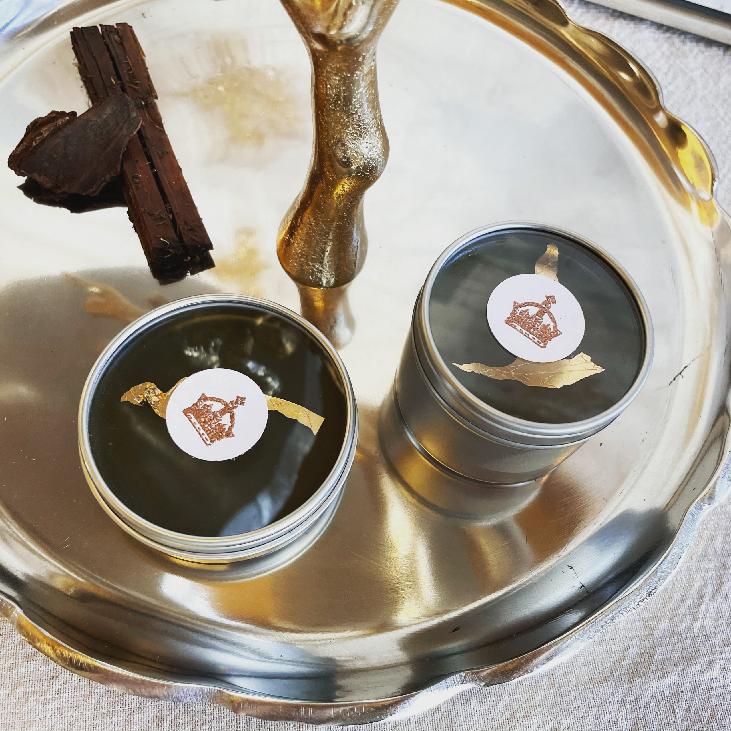Pink, white, and blue lotus with passionflower, valerian, and chamomile in a base of organic, cold pressed, extra virgin olive oil, aged for almost a full year, strained and co-mingled with organic beeswax, essential oils, and absolutes on the day and hour of Venus. Poured into tins and topped with genuine rose gold.