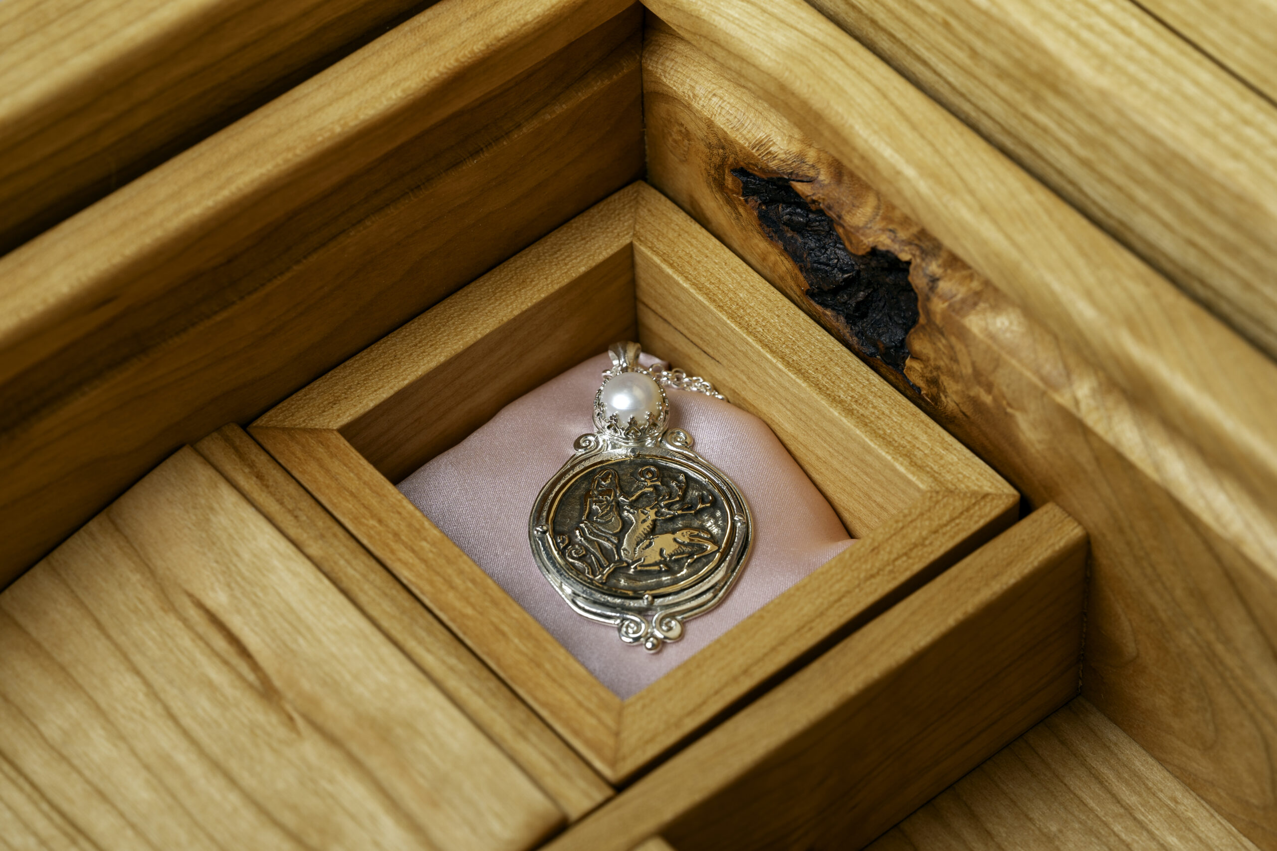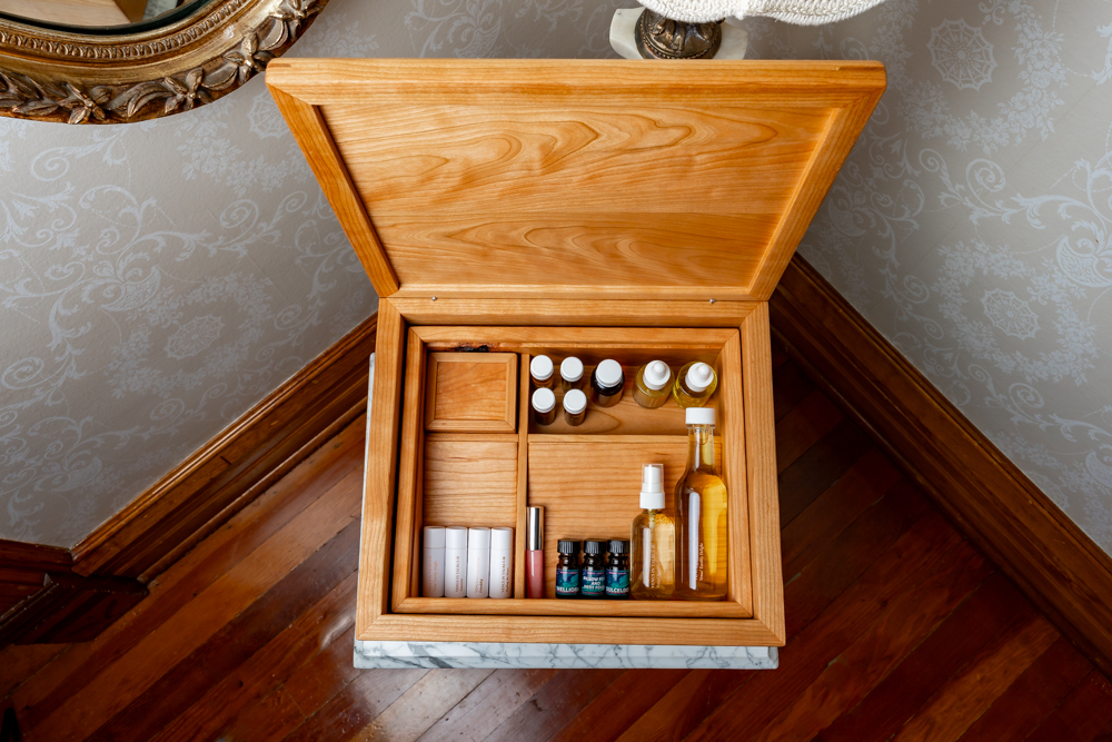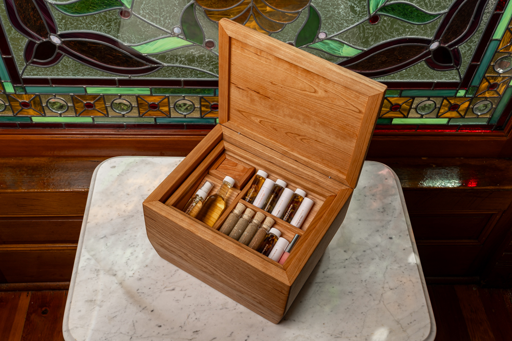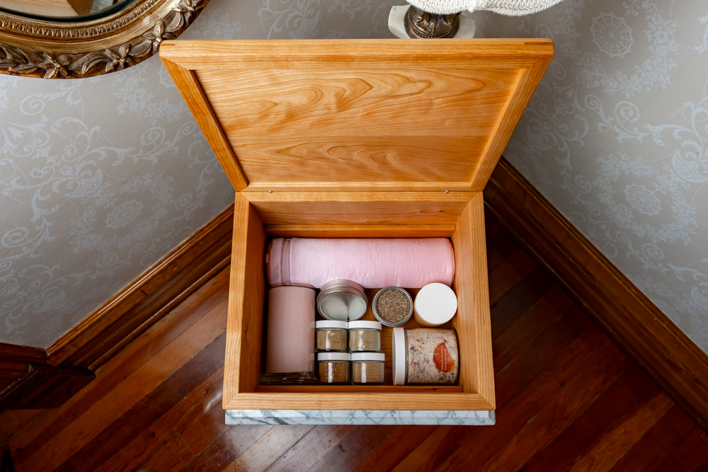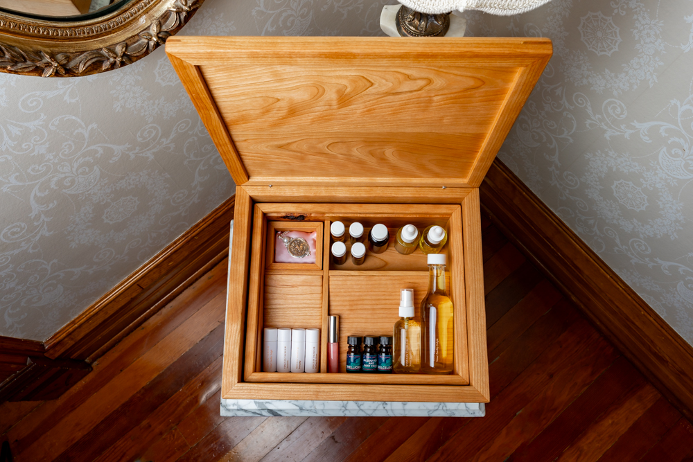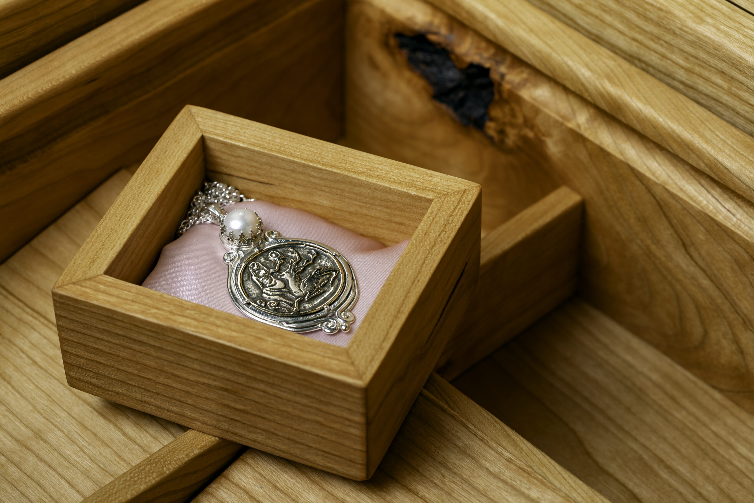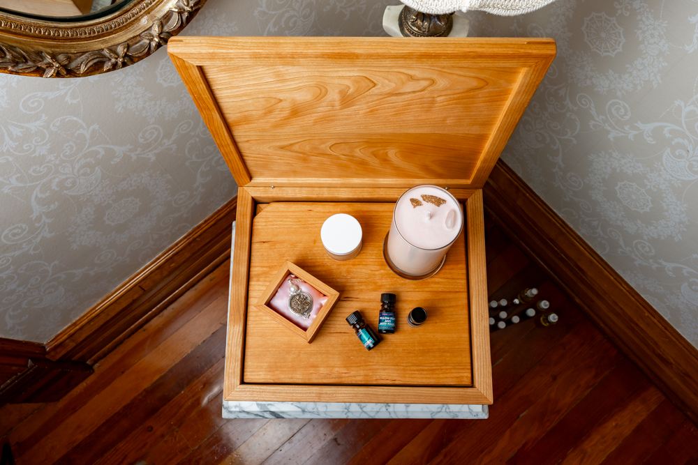 Each includes a small jewelry boxes for Talismans made of matching wood fitted with silk pillows, filled with rose quartz pebbles + consecrated Venus' Earthly Delights herbal mix.