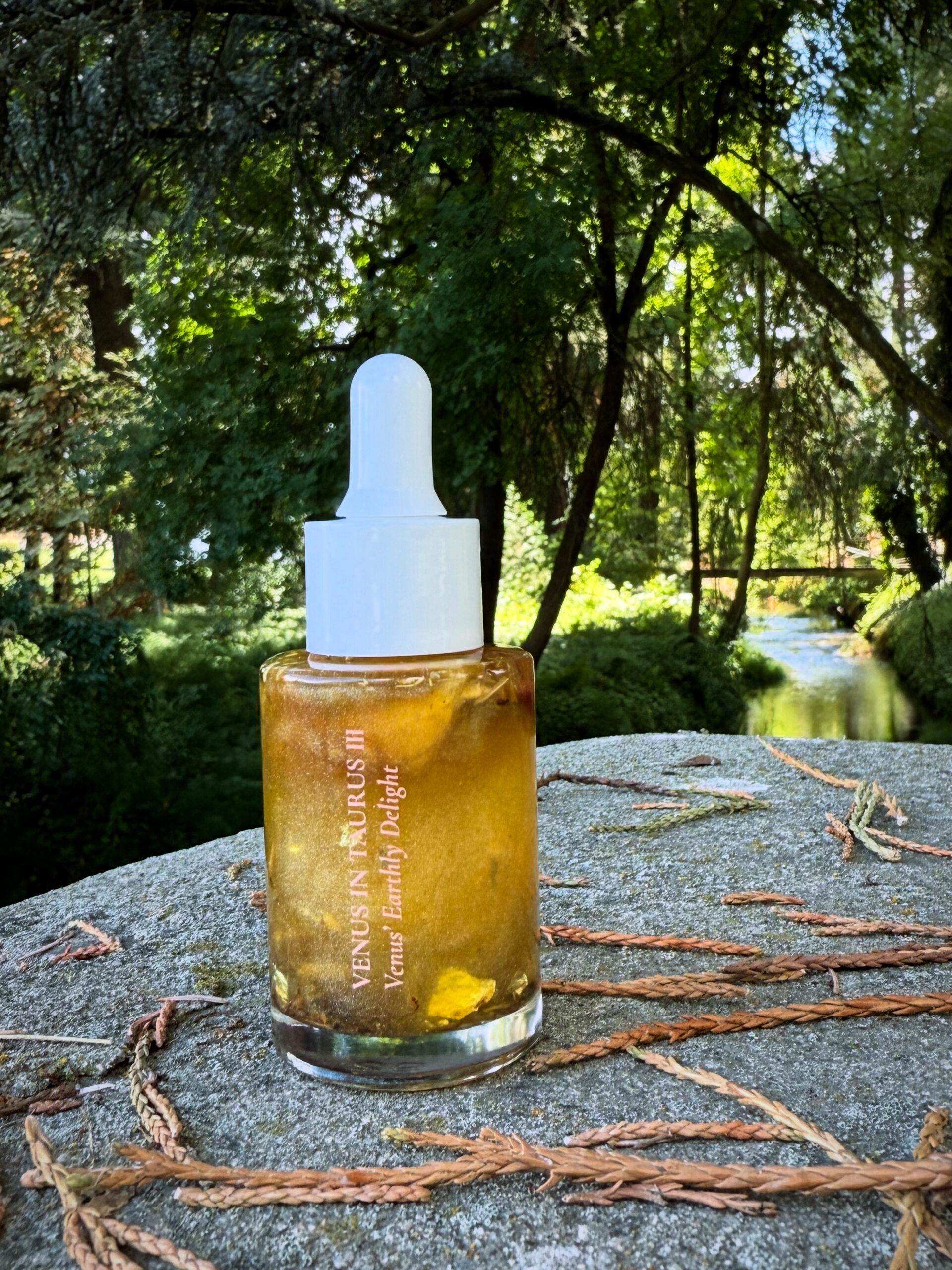Squalane and organic jojoba oil with ritually consecrated, beautifying herbs of Venusian and Taurean provenance.