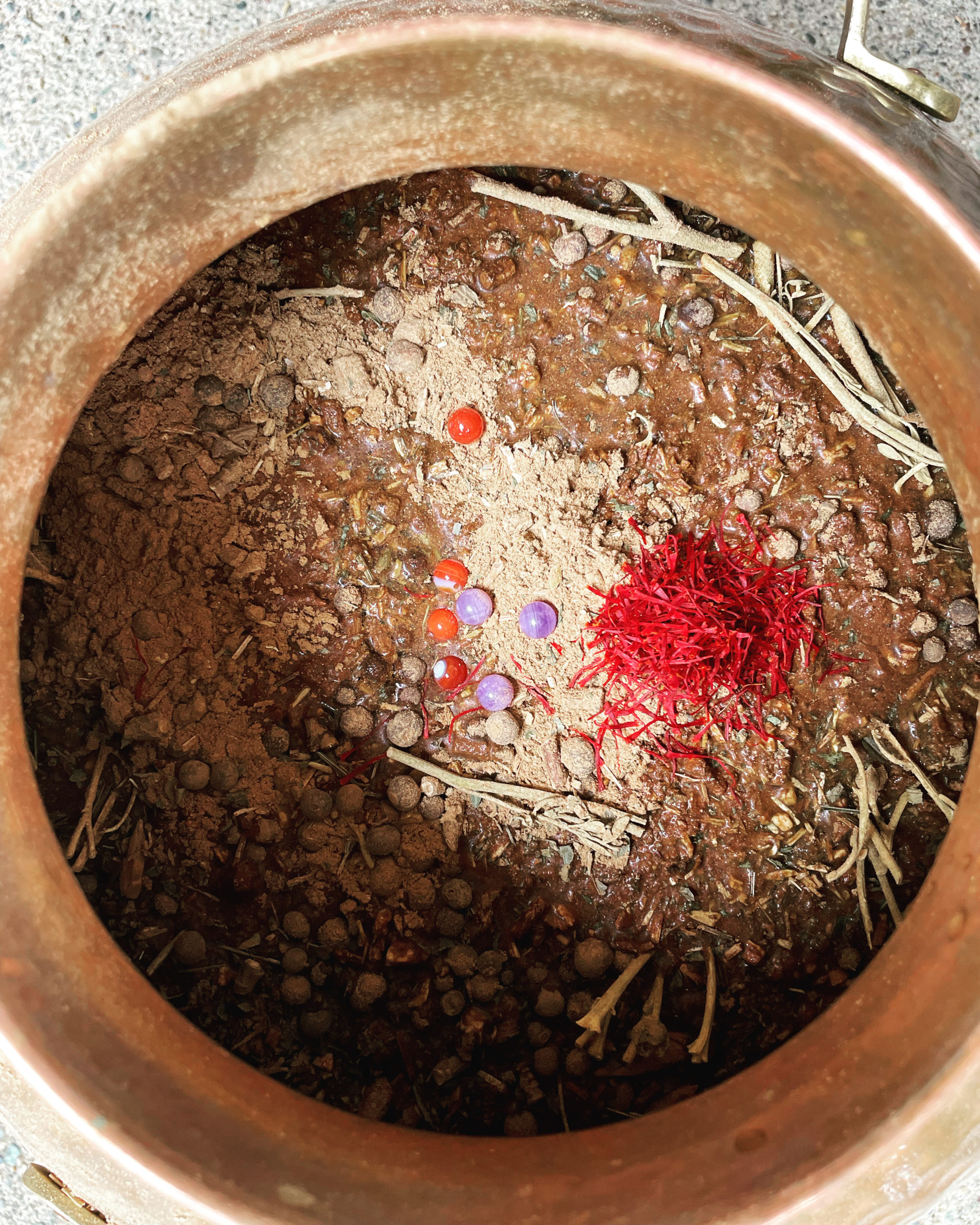 Water harvested from the headwaters of Mt. Shasta; a Martial and Jupiterian herbal blend — including saffron, sardonyx, and amethyst, distilled via copper alembic and entombed in consecrated Antares’ herbal blend for many, many moons.