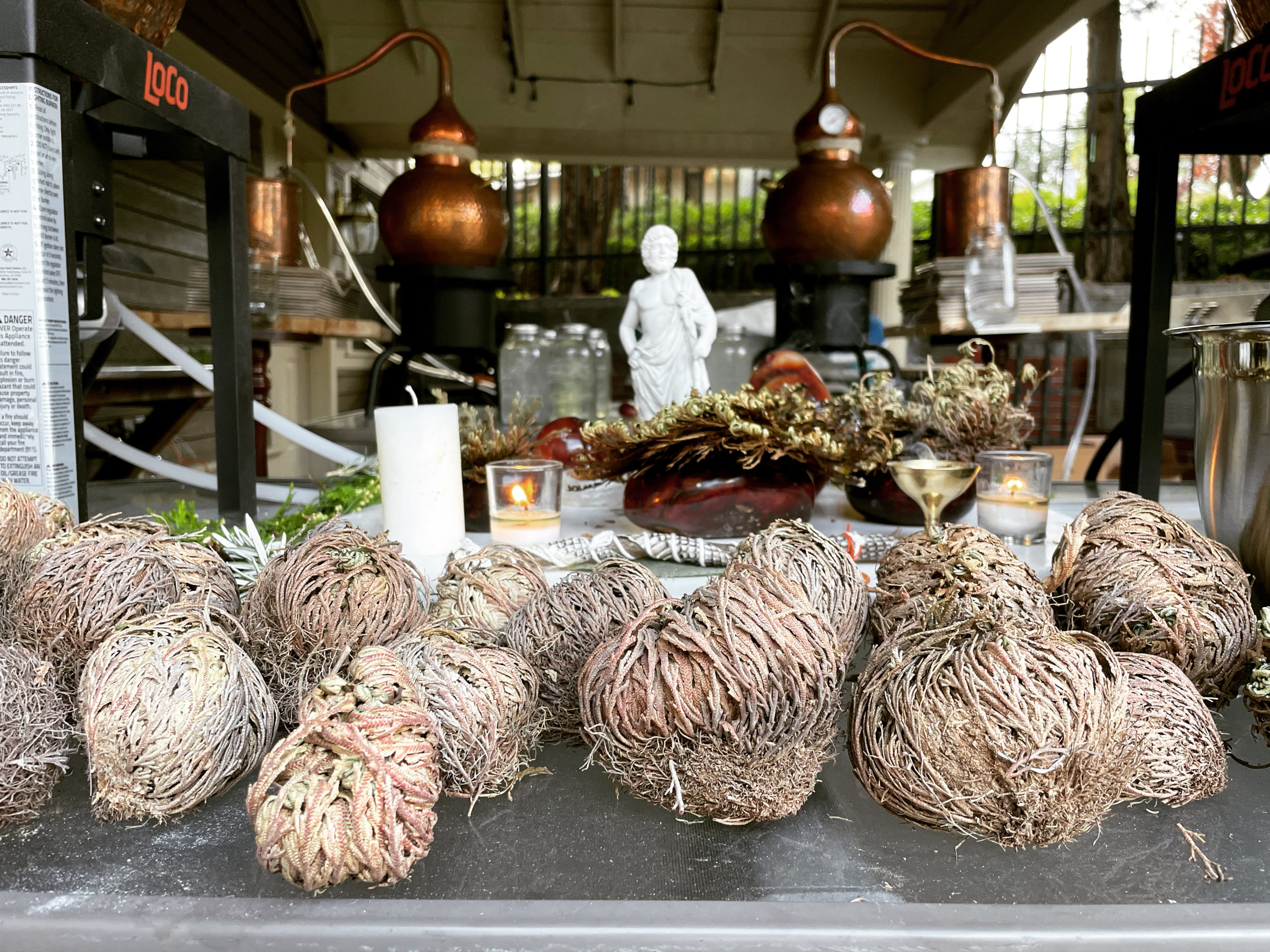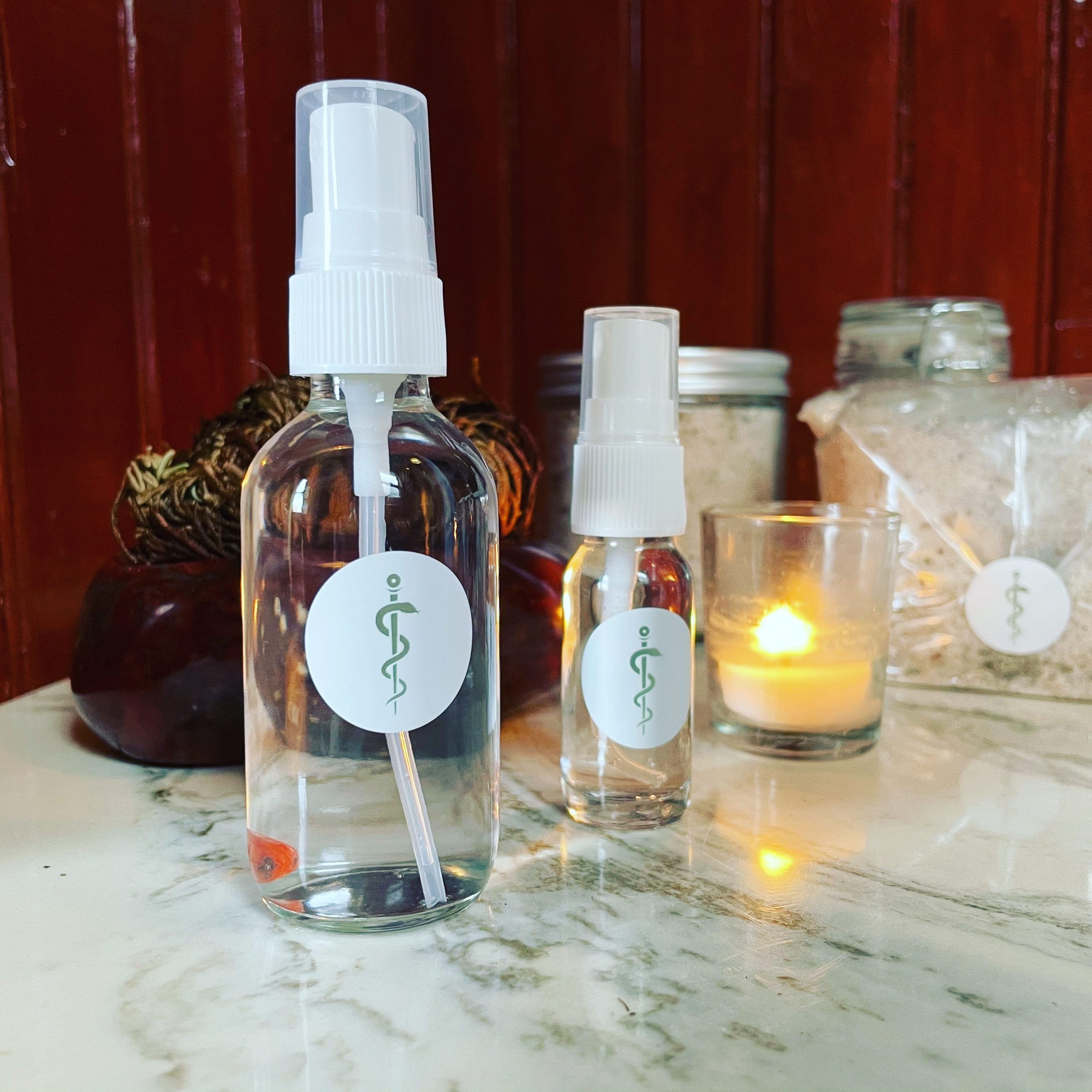 Water freshly harvested from Mt Shasta, distilled via copper alembic with rose of jericho, home grown and ritually harvested sages and incense cedar, and carnelian Asclepius talismans.