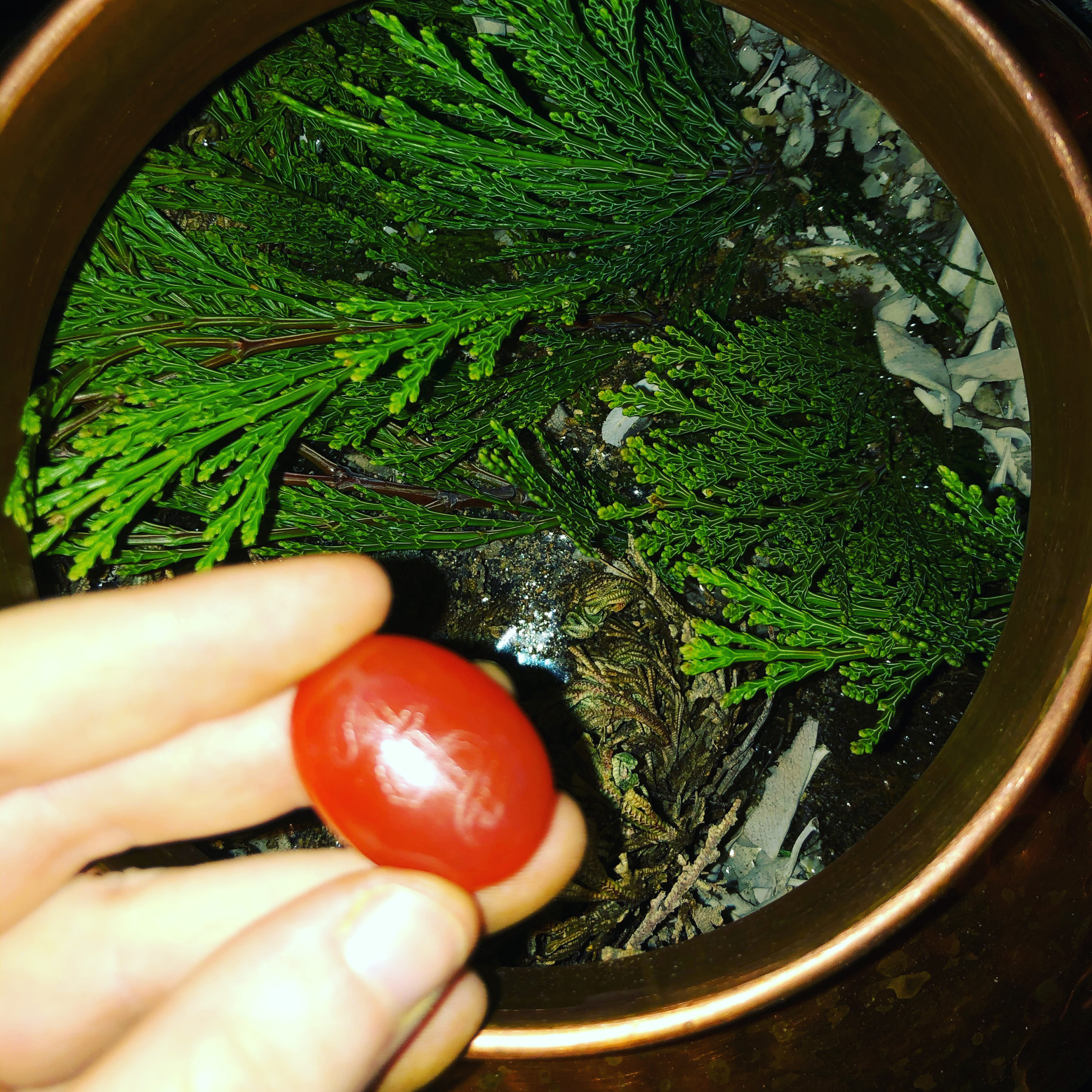 Includes a piece of carnelian in each glass bottle, a stone used in talismanic rings of Asclepius for thousands of years.