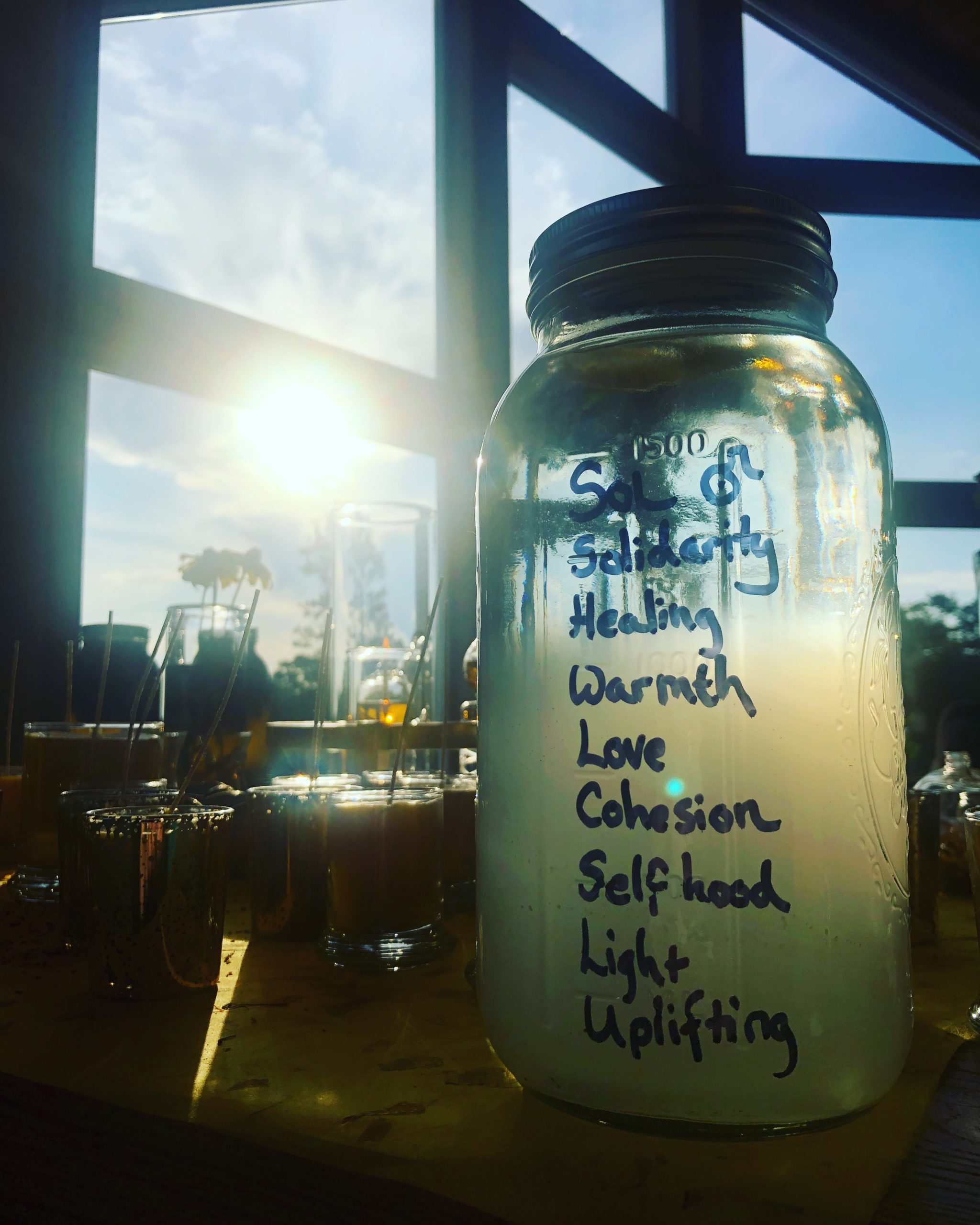 Water freshly collected from the headwaters of Mt. Shasta, distilled via copper alembic from one hour of the Sun to the next on the day of the election. A combination of herbs and gems under the governance and accord of Sol, with Jupiterian emphasis — sunflower, cedar, saffron, bay laurel, ginger, sweet cinnamon, rue, orange, clove, hibiscus, bloodstone, ruby, heliotrope, and colloidal gold.