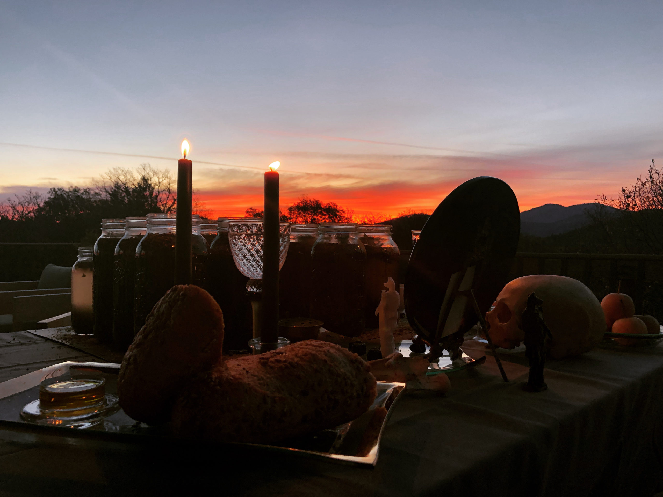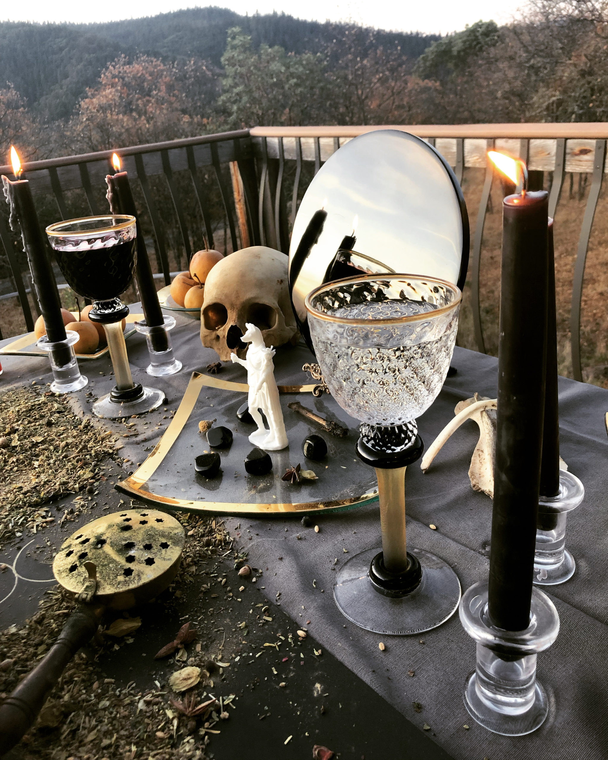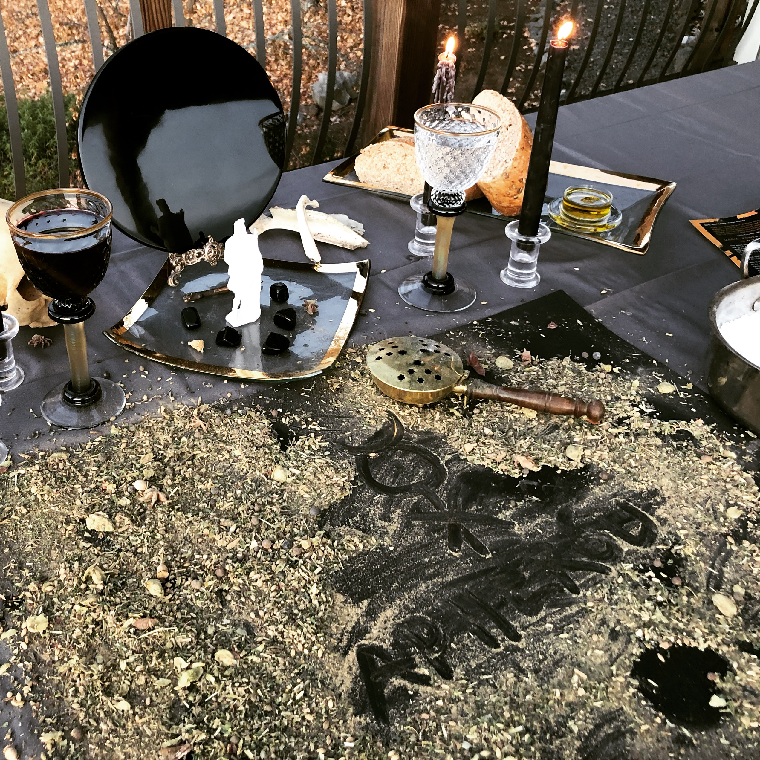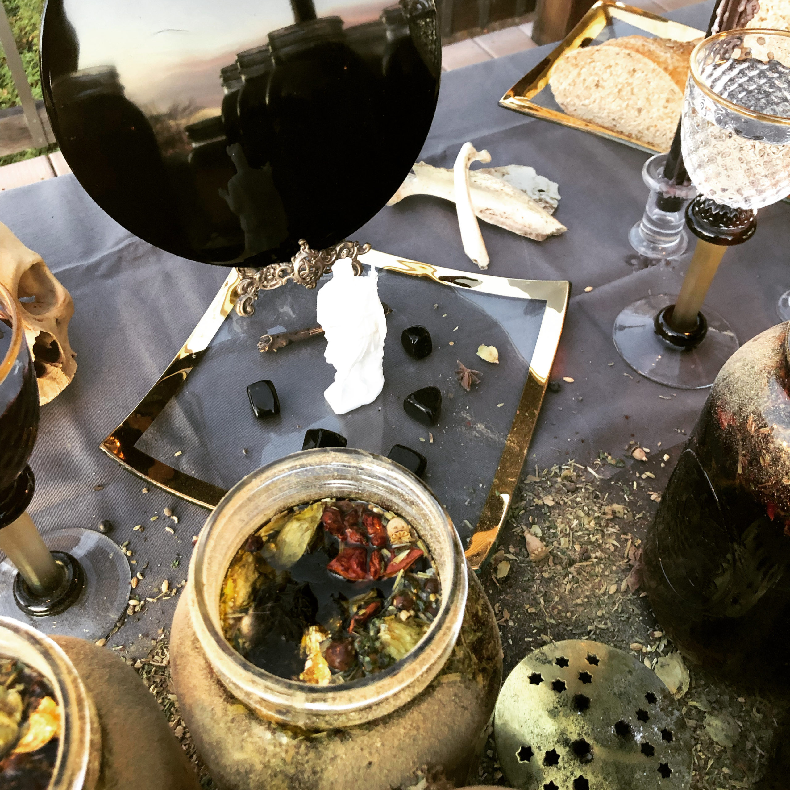 Blood red wine and dark spiced rum, poured over consecrated Hermanubis II herbal mix for attracting the Dead at the height of Mercury’s retrograde Eclipse of the Sun, November 11th, 2019.