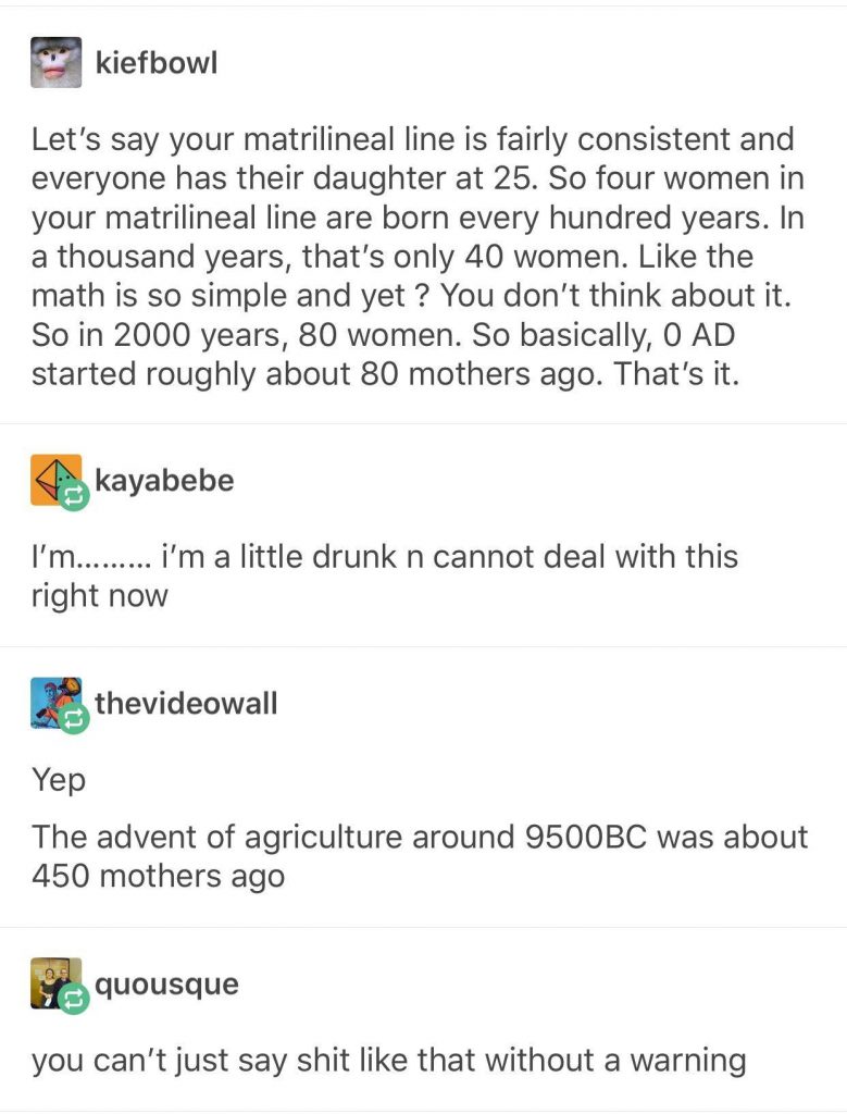 Women are born with every egg they ever ovulate, and then some. That means that the genesis of your being was literally formed IN the womb of your grandmother. You were carried by her, as she carried your mother.
