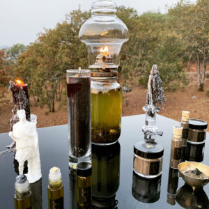 Pomegranate colored coconut-soy blend in glass crowned with 24k gold and sunstone, or beeswax pillars suited to carving and traditional “dressing” practices — poured in real-time during the Leo D3 election window over consecrated powdered herbal base.