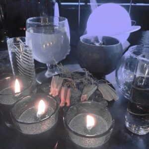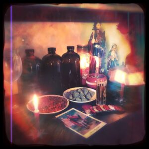 The initial charge for this oil was made on December 20, 2018 during the St. Expedite election window, and was subsequently charged every Wednesday, Thursday, and Sunday through Epiphany, with boosts on Christmas Eve, Christmas Day, New Year’s Eve, New Year’s Day, and Epiphany. Offerings of poundcake, candies, chocolate coins, spring water, incense, fire, coffee, whiskey, and rum were made in supplication during the process under the auspices of both St. Expedite and the Virgin Mary.