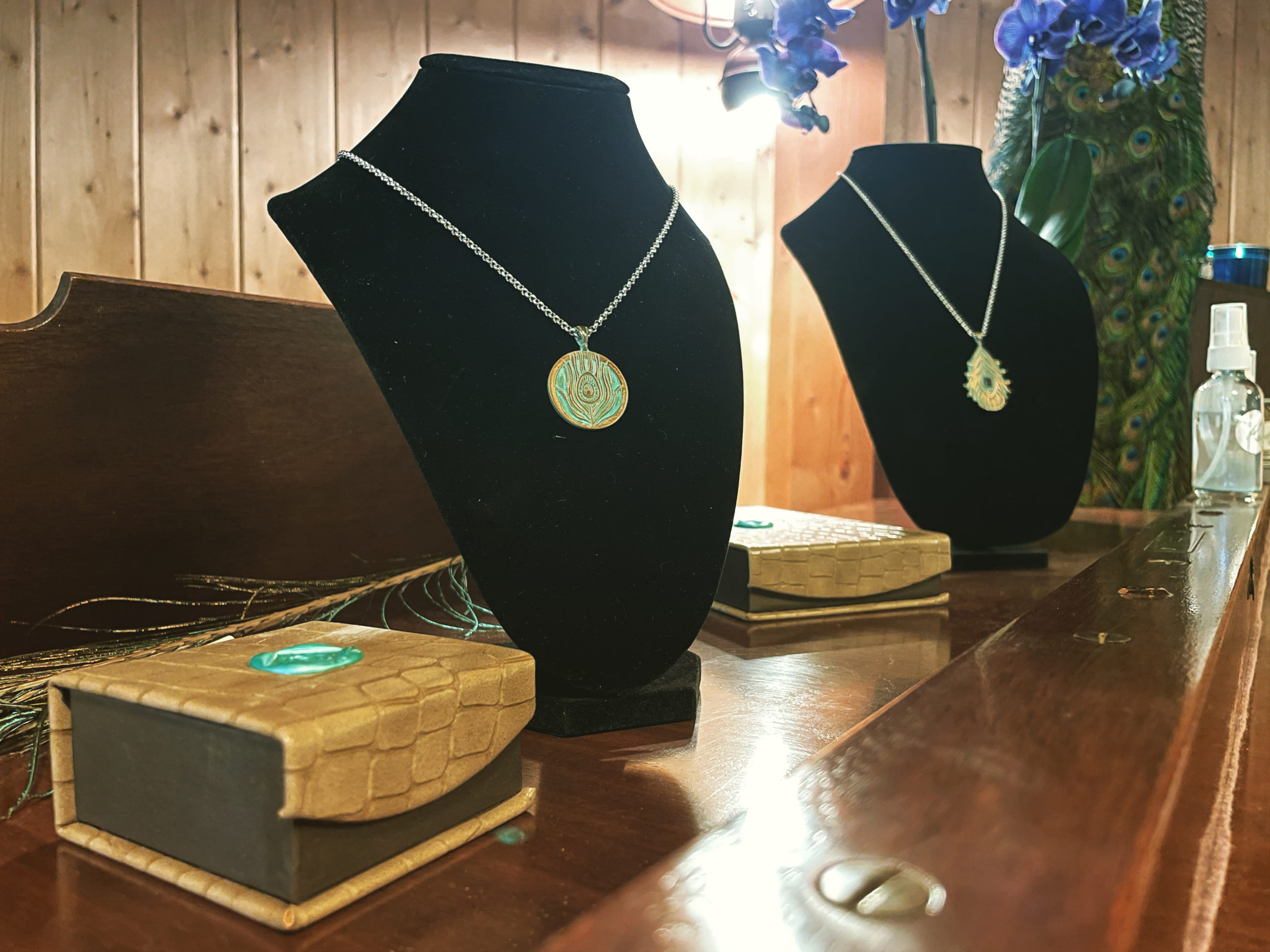 Each talisman arrives in a keepsake jewelry box bearing a wax seal of a peacock’s tail, and a vial of Quicksilver Tongue Powder.
