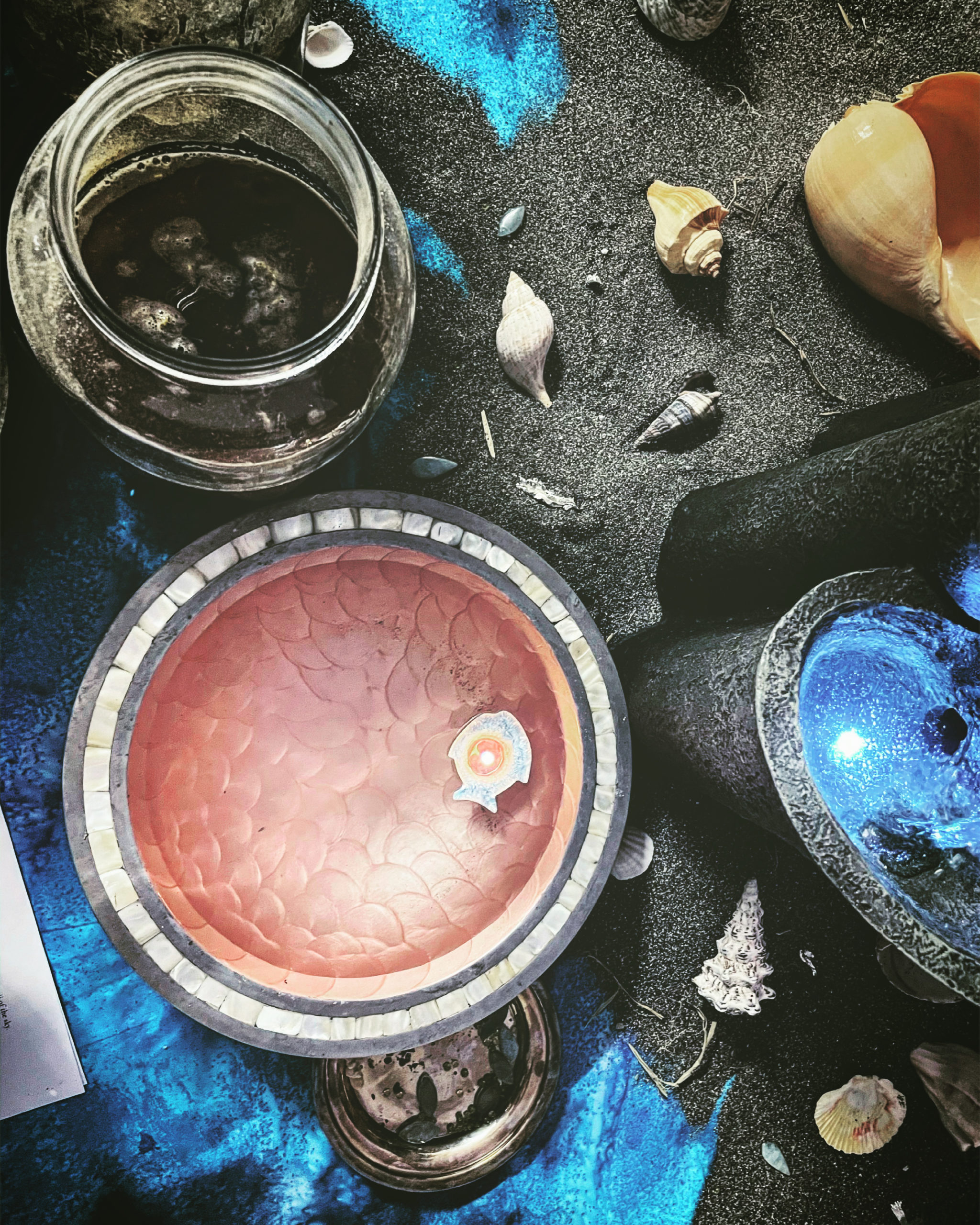 With Luna attending and Pisces rising in the hour of Jupiter, freshly harvested Sea water filled a central basin and tall fountain with iridescent blue light, sand and shells strewn over the altar cloth. A floating fish-shaped candle was lit, fumigants and prayers ascending to the deepest, most desolate Heavens.