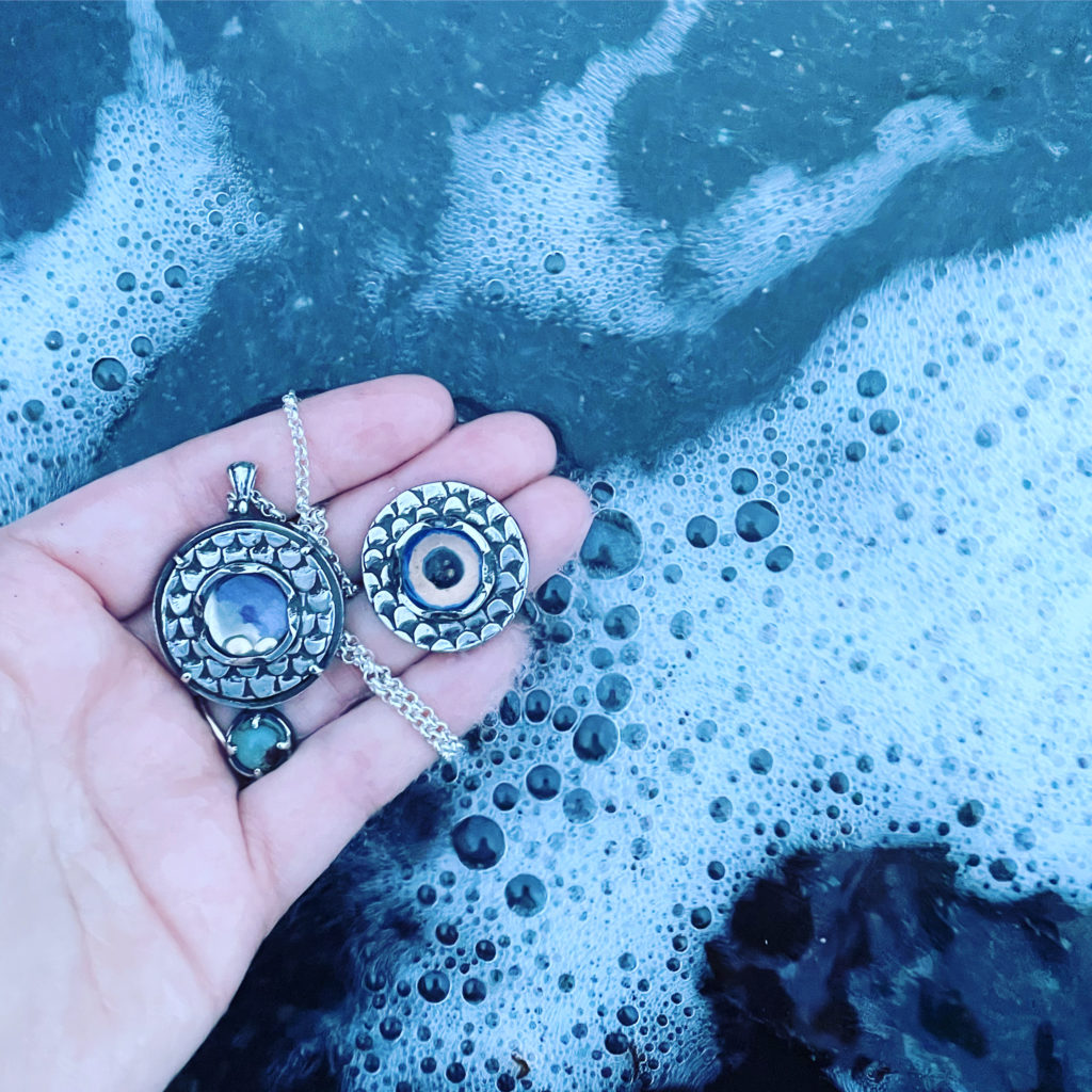 The eye of the “Southern Fish” surrounded by a motif of scales. Yarrow flower, blue lotus, kelp, and gold were placed inside the ‘iris’ and set-over with a magnifying lens of quartz crystal.