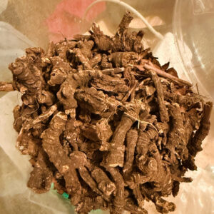 High John the Conquerer and low john roots, devil’s shoestring, master root, Solomon’s seal, osha root, poppy seed, holy basil, turmeric, frankincense, deer’s tongue, white ginseng, dragon’s blood, patchouli, vetiver, hyssop, dill, and more galangal. 24k gold.