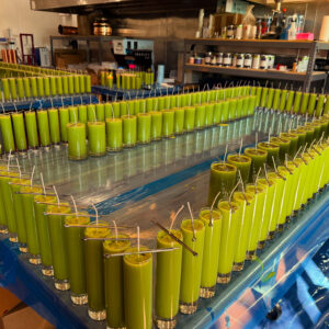 An uplifting new-growth green which creates golden wax pools; poured within the election window over consecrated Spican herbal mix powdered with 24k gold, which also crowns each one.