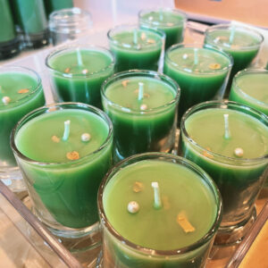 Lilac from the TAL garden (Syringa vulgaris), lemon verbena essential oil and herb from the TAL garden (Aloysia citriodora), catnip essential oil and herb from the TAL garden (Nepeta cataria), lemon essential oil and peel from the TAL garden (Citrus x limon), Sri Lankan lime essential oil and peel (Citrus x aurantifolia), cardamom essential oil and green pods (Elettaria cardamomum), lemongrass essential oil and leaf from the TAL garden (Cymbopogon flexuosus), Bulgarian rose absolute (Rosa damascene), red sage root (Salvia miltiorrhiza), vetiver essential oil (Vetiveria zizanioides), periwinkle (Vinca minor), white sage from the TAL garden (Salvia apiana) and clary sage essential oil (Salvia sclarea), mugwort essential oil and herb from the TAL garden (Artemisia vulgaris), mandrake root (Mandragora officinarum), and red clover blossoms from the TAL garden (Trifolium pratense).