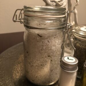 Dead Sea salt, Himalayan pink salt, and epsom salt were combined with essential oils of frankincense, cypress, and tea tree, alongside herbs from the incense mixture, with Asclepius’ blessing.
