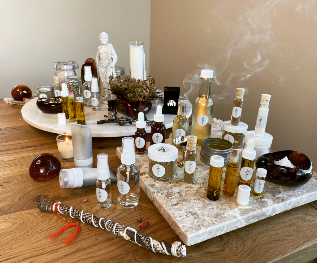 Sphere + Sundry’s classic Asclepius herbal formula, ritually created on an election featuring the Moon conjunct the Divine Physician’s patron star, Ras Alhague, in trinal application to the exalted Aries Sun conjunct the IC of the chart.