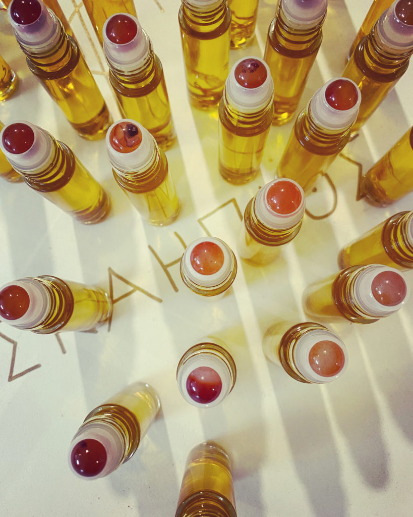 Offered in your choice of 1/2 oz glass vial w/ 24k gold for $65 (with an optional dropper cap kit), or 10 ml roll-on with carnelian rollerball for $52
