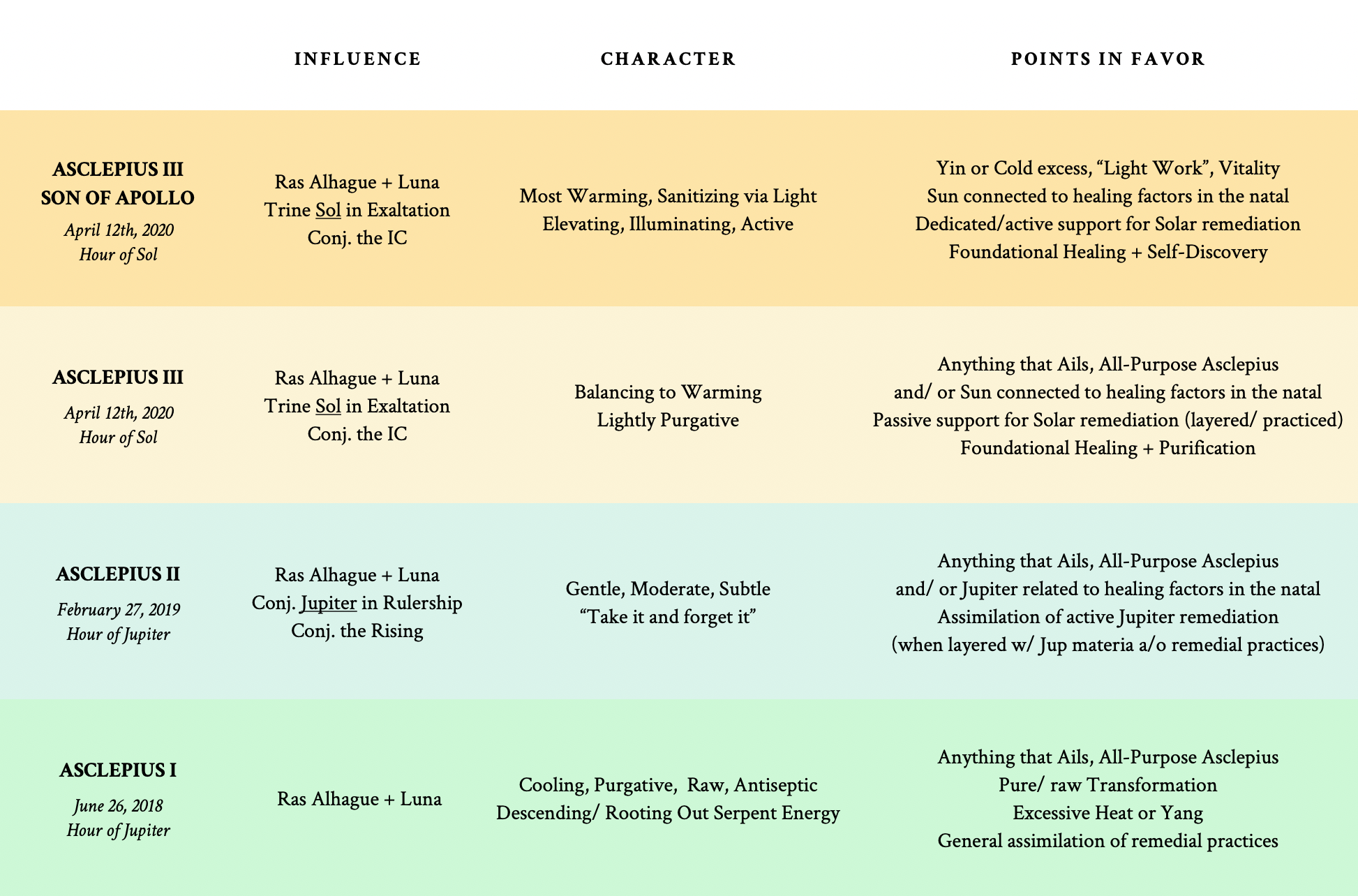 first Asclepius series has been sold out for some time, it bears mention because clients who still have it in their arsenal or possess familiarity with its effects may be curious to explore how it compares to the others. Maiden Asclepius was the most purgative and energetically antiseptic of them all, resulting in the most intense reports of healing crises. The presence of Jupiter and the Sun in subsequent iterations provide more of an energetic buffer against the chaffing of the process inherent to healing, purgation, transformation, and recovery.