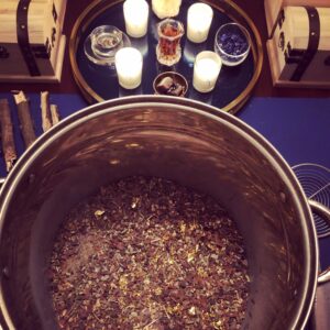 Warming, quickening herbs and barks such as cinnamon, allspice, and clove act to invigorate and empower, as well as provide a fitting sensory backdrop for the upcoming northern hemisphere’s fall/ winter weather and Christmas season. The Jup-Juice spray, self-igniting incense, and Lightning Rod powder all smell of delicious mulling spices simmering on the stove, or warm spice bread, fresh from the oven.