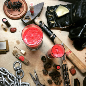 create potent talismanic materia of a Martial nature while mitigating malefic fallout. A combination of classical ingredient associations for Mars, such as bloodstone, red jasper, peppercorn, red ginseng, stinging nettle, scorpion pepper, and the like, in addition to other herbs and sundries typically employed in Hoodoo and Conjure for promoting fortitude, strength, potency, and victory, such as High John the Conquerer Root, Devil’s shoestring, and Devil pod.
