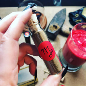 A blend of organic herbs, resins, and gems of martial nature and correspondence, including bloodstone, red jasper, red ginseng, scorpion pepper, stinging nettle, basil, pink and black peppercorn, ritually suffumigated with Mars’ Degree of Exaltation incense during the pre-dawn hour of Mars on New Year’s day 2020.