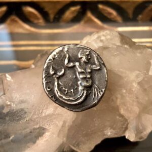 Lost-wax cast in fine silver. Modeled in carver’s wax after an ancient Greek coin depicting the god Triton, son of Poseidon and messenger of the sea, circa 370BC. Slight modifications were made so we could offer mer-talismans in lad and lady varieties.