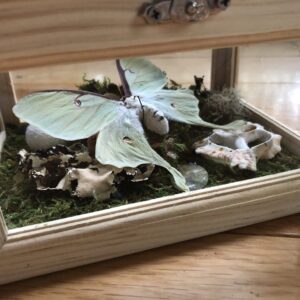 Real moss covers the floor of these beautiful reliquaries, which contain a Lunesta moth as the primary centerpiece, assisting in spirit and astral flight. A whole silk cocoon, the worm still within, represents dream incubation. Includes sympathetic herbs, mushrooms, shells, saltwater pearls, and a phrenite crystal. Starfish decorate the top glass panel, as a representation of the stars above, but also the oceans below, facilitating liminality via inversion.