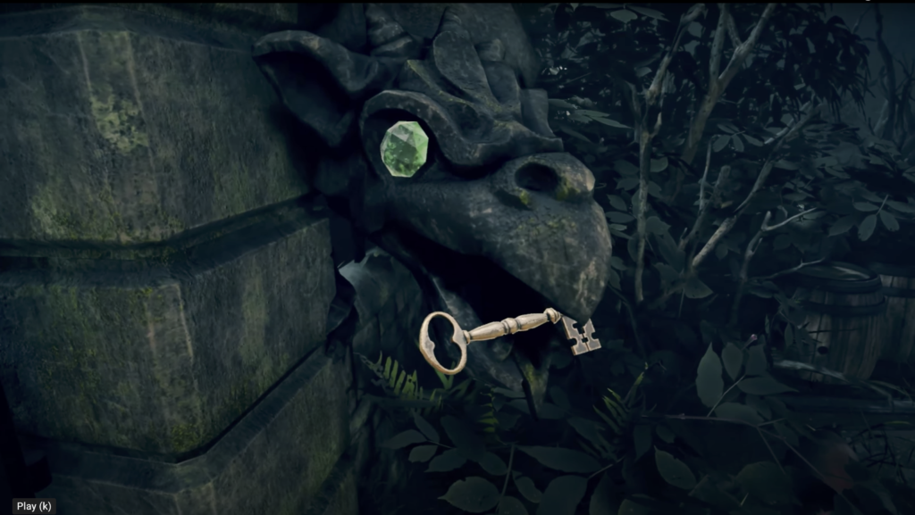 The lamp’s gaze restores an 8-plank bridge, leading to a gate warded by twin dragon-goyles. An orbital gem (Emerald in this operation… Mercury) is taken from one and placed in the socket of the other, re•pairing its two eyes (dual Luminaries…), which triggers the release of a golden key, which opens the lock that had previously barred our entry.