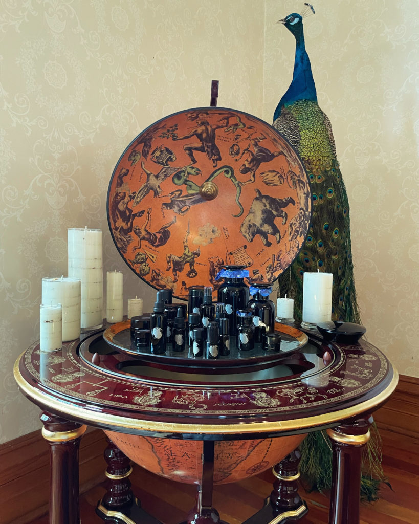 Thema Mundi will be bottled to order exclusively by its Creatrix, in Miron violet glass akin to its altar cloth, preserving its contents for years to come.