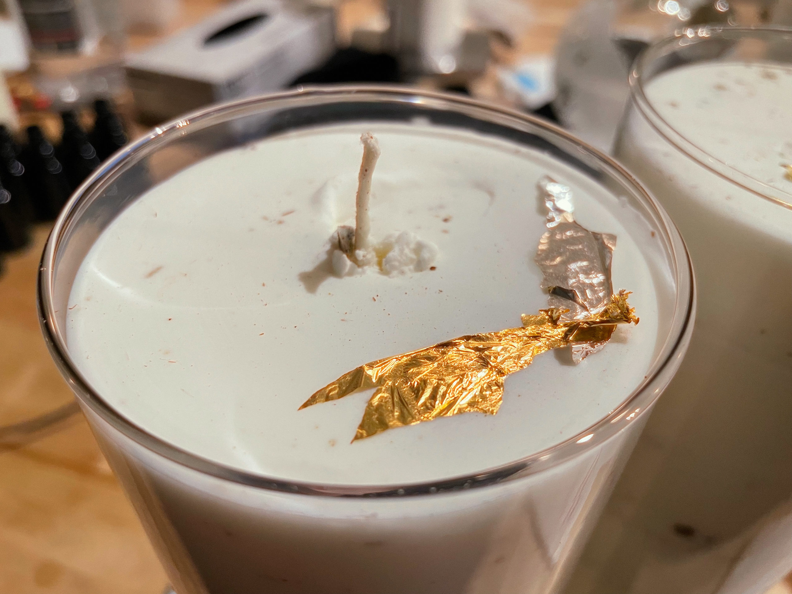 The base here is 100% olive oil. Topped with sterling silver leaf and 24k gold.